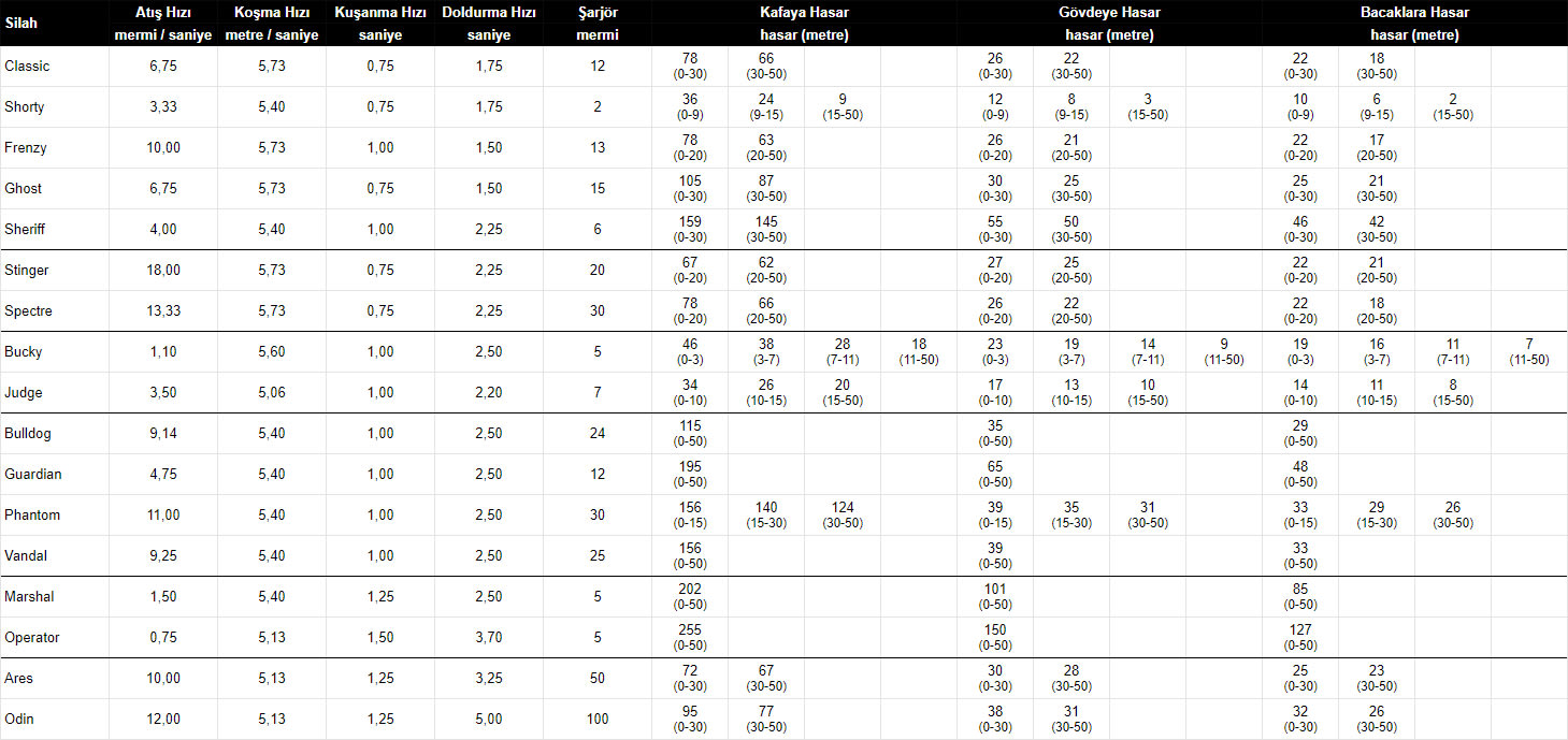 Riot Games’in yeni fenomeni Valorant kısa sürede piyasanın en çok oynanan çevrimiçi “shooter” oyunlarından biri olmayı başardı. Oyunculara birbirinden farklı özelliklere sahip ajanlardan oluşan beşer kişilik takımlar halinde kıyasıya mücadele şansı veren oyunda elbette ajanların yetenekleri kadar silahlar da büyük önem arz ediyor. An itibariyle oyunda beylik silahı, hafif makineli, pompalı tüfek, tüfek, keskin nişancı tüfeği ve ağır silah kategorileri altında 17 silah yer alıyor. Bu yazıda silahlara dair genel bilgilerin yanı sıra detaylı bir karşılaştırma tablosu bulacaksınız. Özellikle silahların verdiği hasarı değerlendirirken, alt etmeniz gereken bir rakibin 100 sağlık puanına hafif zırh ile 25, ağır zırh ile 50 puan daha ekleyebileceği ihtimalini unutmayın.