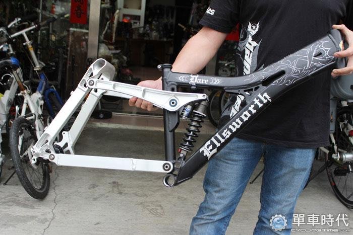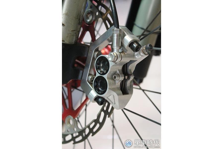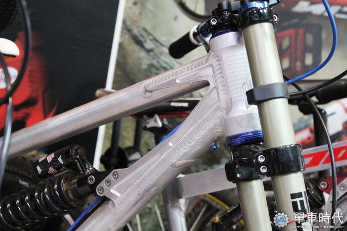 下坡車運動(Downhill,簡稱DH),顧名思義,是為了騎乘高低落差較大的路線而來,為了承受較大的撞擊,車架整體的結構更加粗壯,重量也動輒超過15公斤,細細觀察,其中還有補強片的設計,Ike說這是經由受力精密計算後的成果。