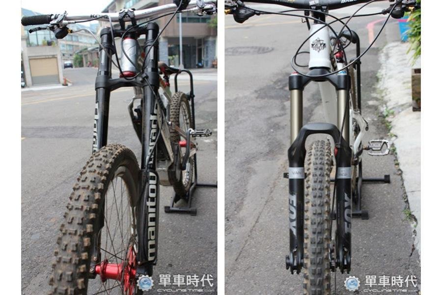 面對不同路段的挑戰,下坡車需要避震器來降低對車手與戰馬的衝擊,從這2支前叉的結構中,車友可以看出單肩(1個肩蓋,見下圖右)與雙肩(2個肩蓋,見下圖左)的差別。