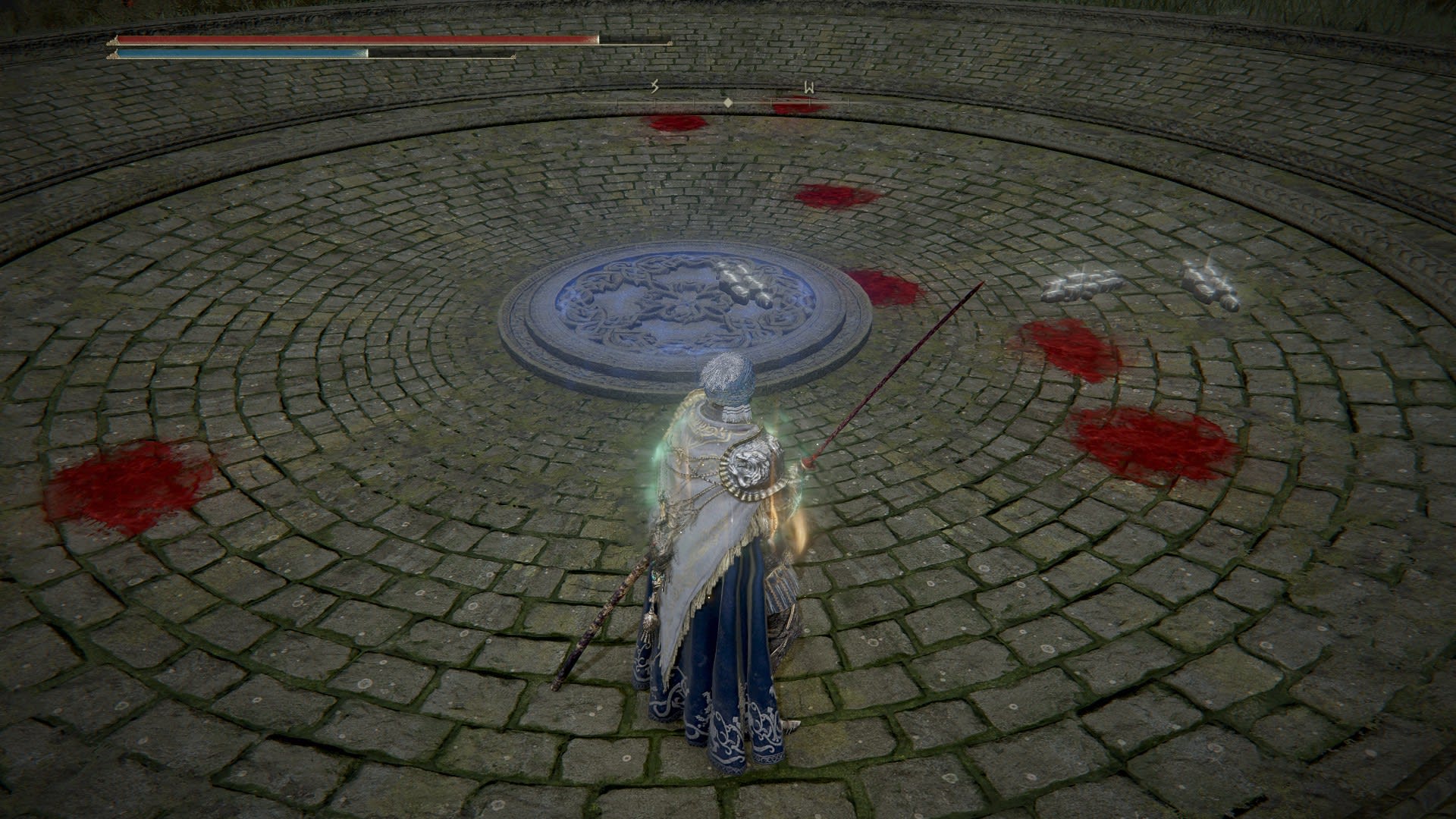 上圖中,紅色的是血跡,白色並排的石頭條,是其他玩家留下的訊息條