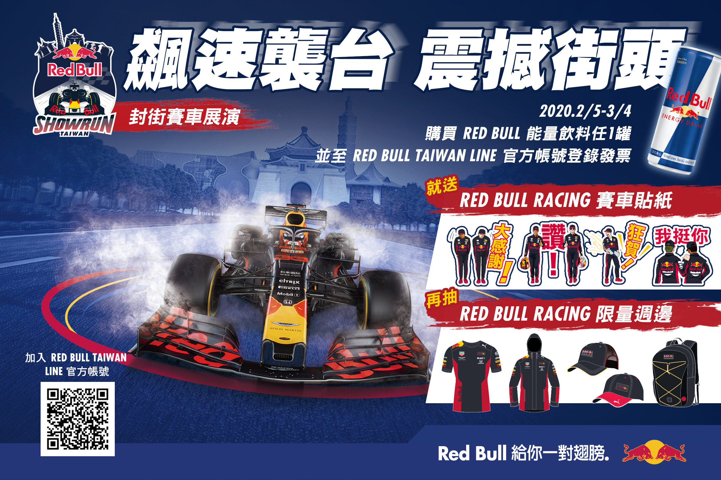2020 年 2 月 5 日起,加入 Red Bull Taiwan Line 官方帳號,完成任務就能領取 Red Bull Racing 官方限量 Line 貼圖!購買 Red Bull 能量飲料任1罐,登錄發票再送 Red Bull Racing 賽車貼紙,還有機會獲得限量周邊,讓你無時無刻都能帶著 Red Bull Racing 的能量一起狂飆!
