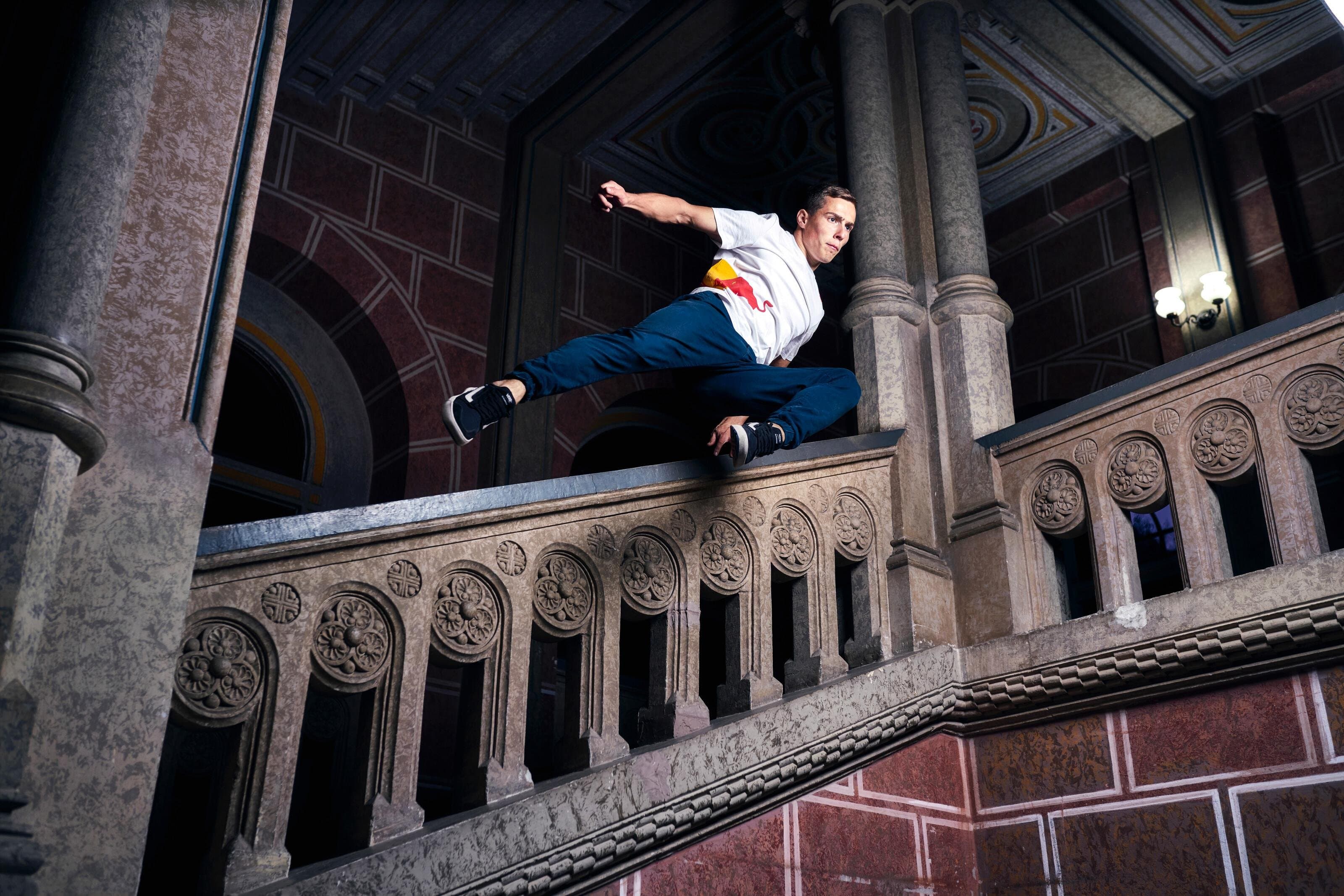 Тому йому доводиться прокладати свій маршрут через університет у вкрай екстремальний спосіб, залучаючи до цього сходи, стіни, вікна та все, що підвернеться на шляху.
