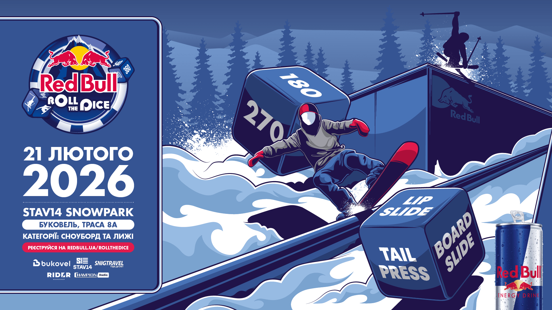 Red Bull Roll The Dice 2026 відбудеться на трасі 8А у нижній частині сноупарку STAV14. Уже сьогодні локація відкрита для охочих — дістатися сюди можна зі стандартним скіпасом Bukovel, піднявшись бугельним підйомником.