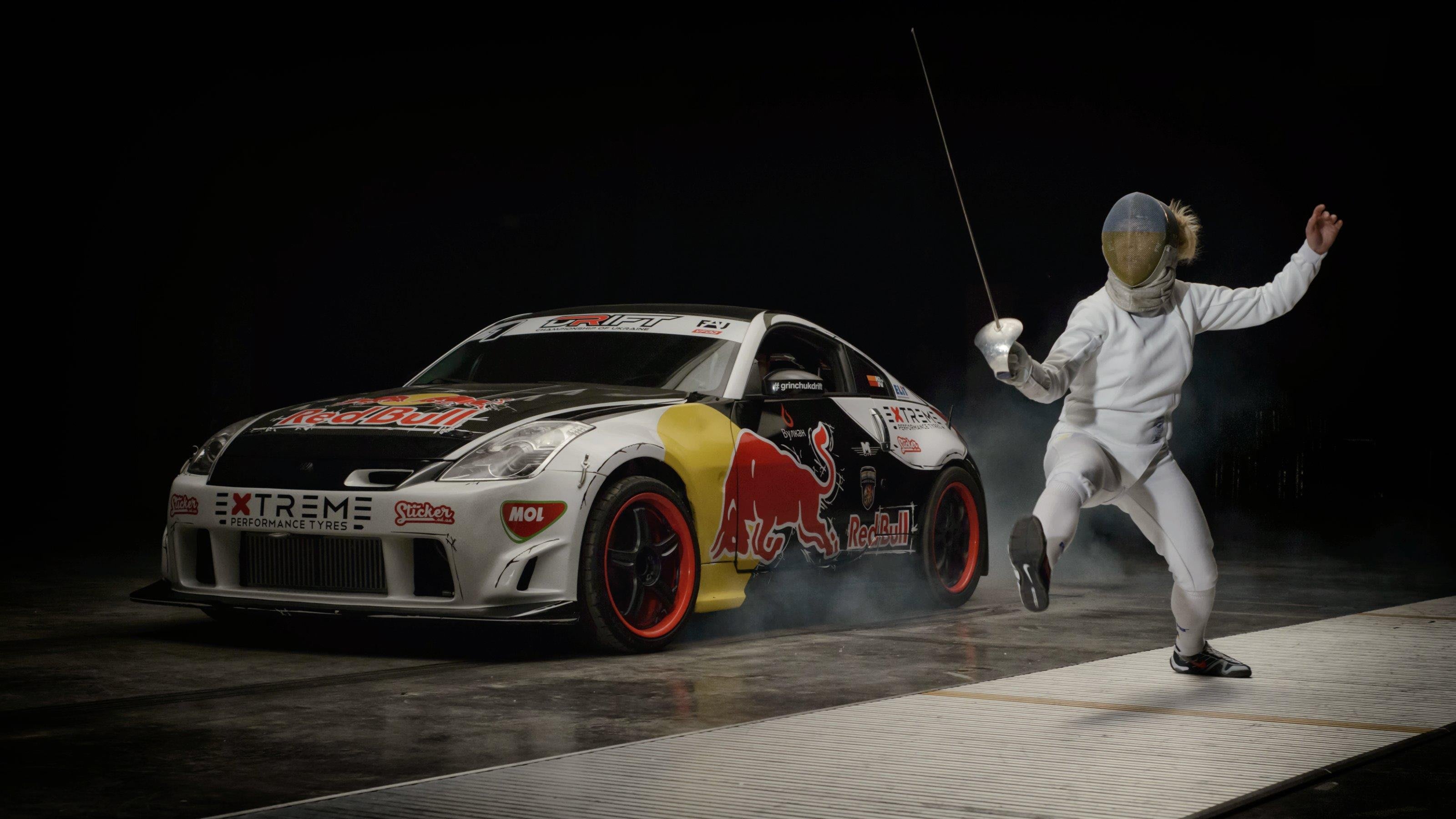 Важливий елемент фехтування – крок-випад. Швидкість виконання цього прийому професійним спортсменом можна порівняти зі стартом спортивного автомобіля. Що буде, якщо на стартовій прямій поруч з Ольгою поставити 600-сильний #redbull350z Олександра Гринчука, який бере «сотню» за 4 секунди? Багатьох здивує результат цього змагання.