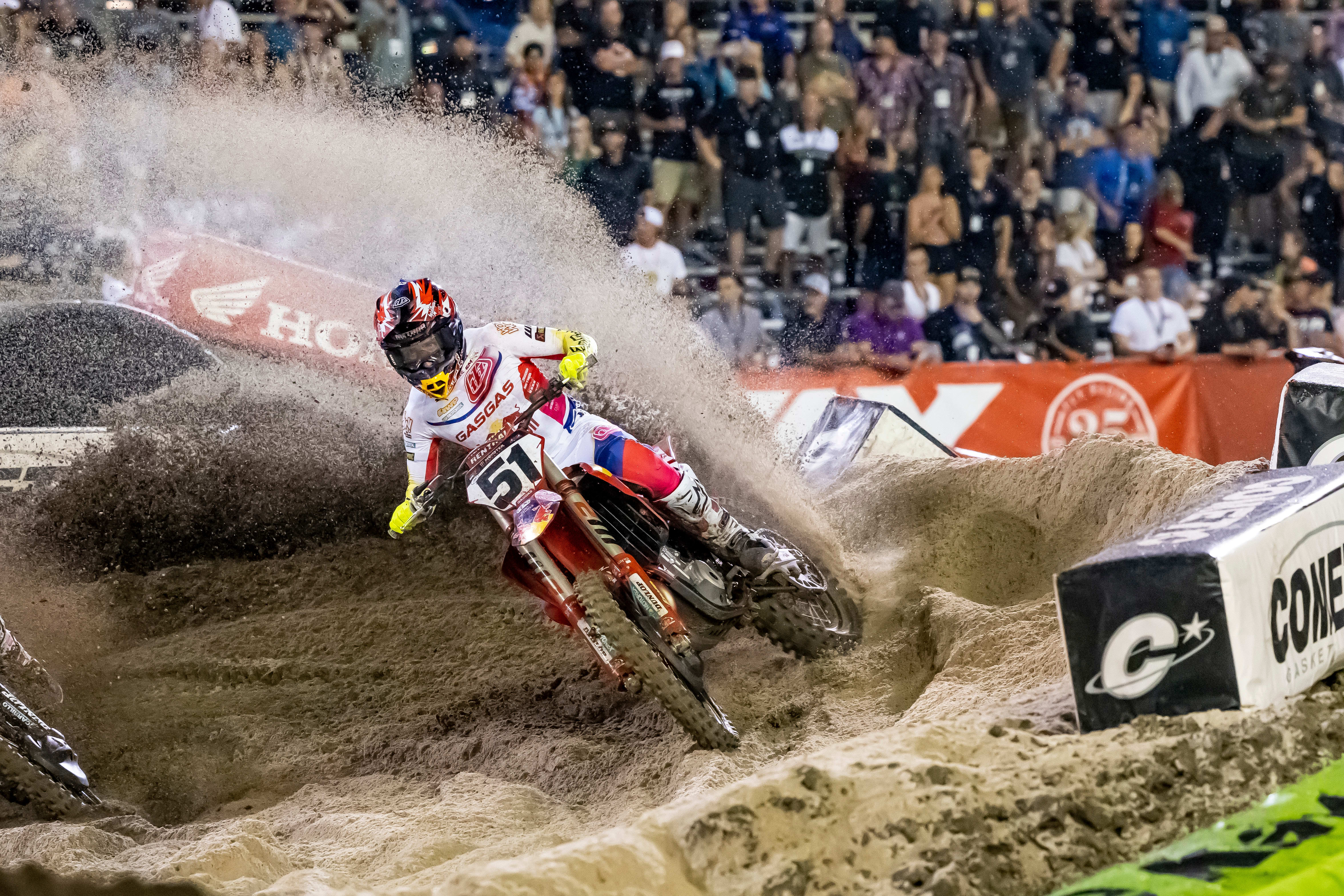 “Well, the best way to put it is that it feels like home to me,” said Tomac. “I practice on a pretty loose soil, it’s not that sandy, but it’s somewhat close. That’s the only thing I can point it to. Early in the day, though, I was wondering what the heck was going on. I was off over a second in practice and trying to find a general flow. I don’t know, once the lights came on, I was a different dude. I went at this there with Cooper [Webb], back and forth there. It was a gnarly battle, once again down to the wire.”