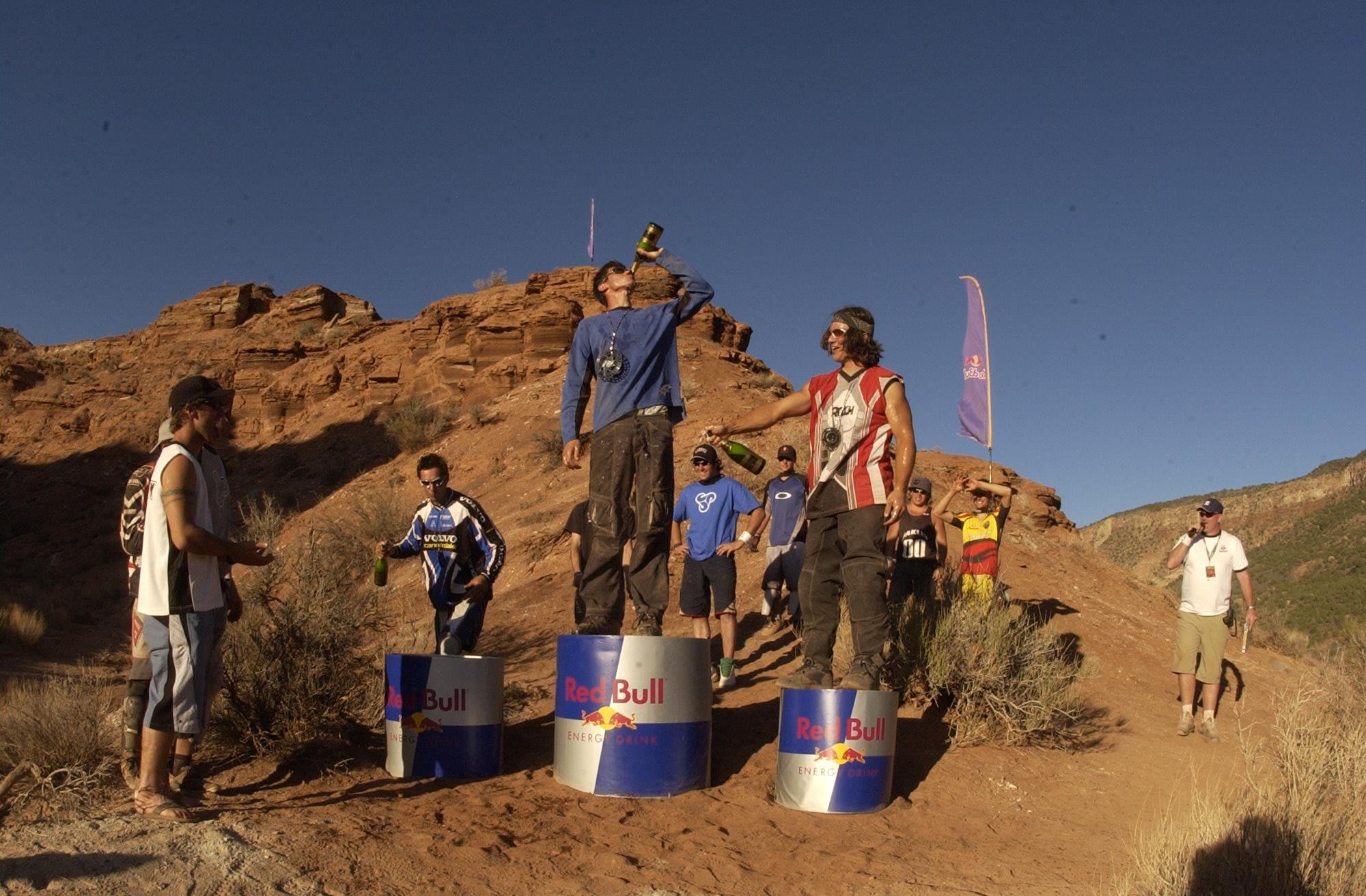 UCI World Cup Downhill racer and third place finisher Cedric Gracia joins winner Tyler "Super T" Klassen and surprise second place finisher Darren Berrecloth on the podium at Red Bull Rampage 2002. Klassen's run culminated in a simply humongous drop that changed how everyone looked at both possibilities on the bike and in their construction.