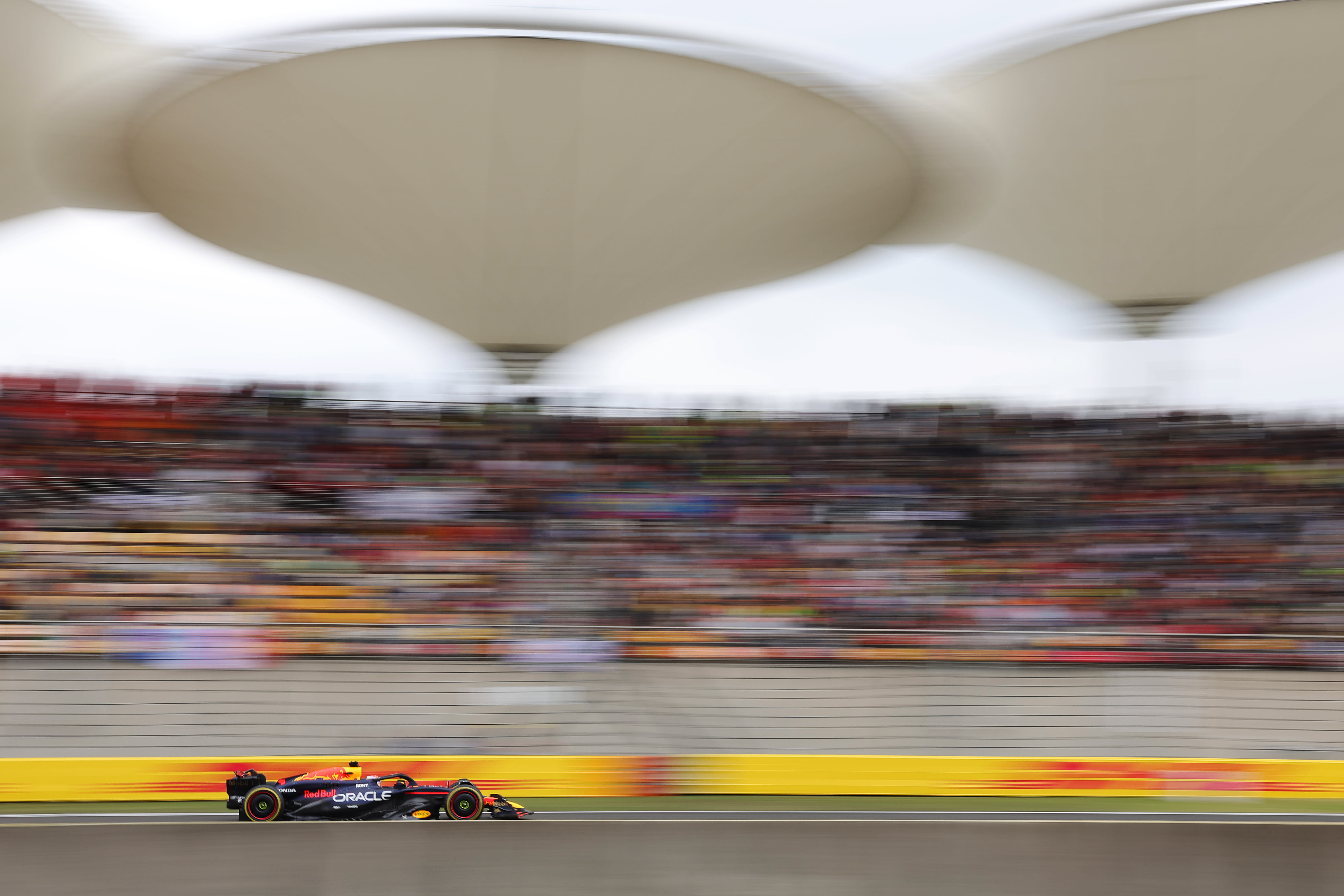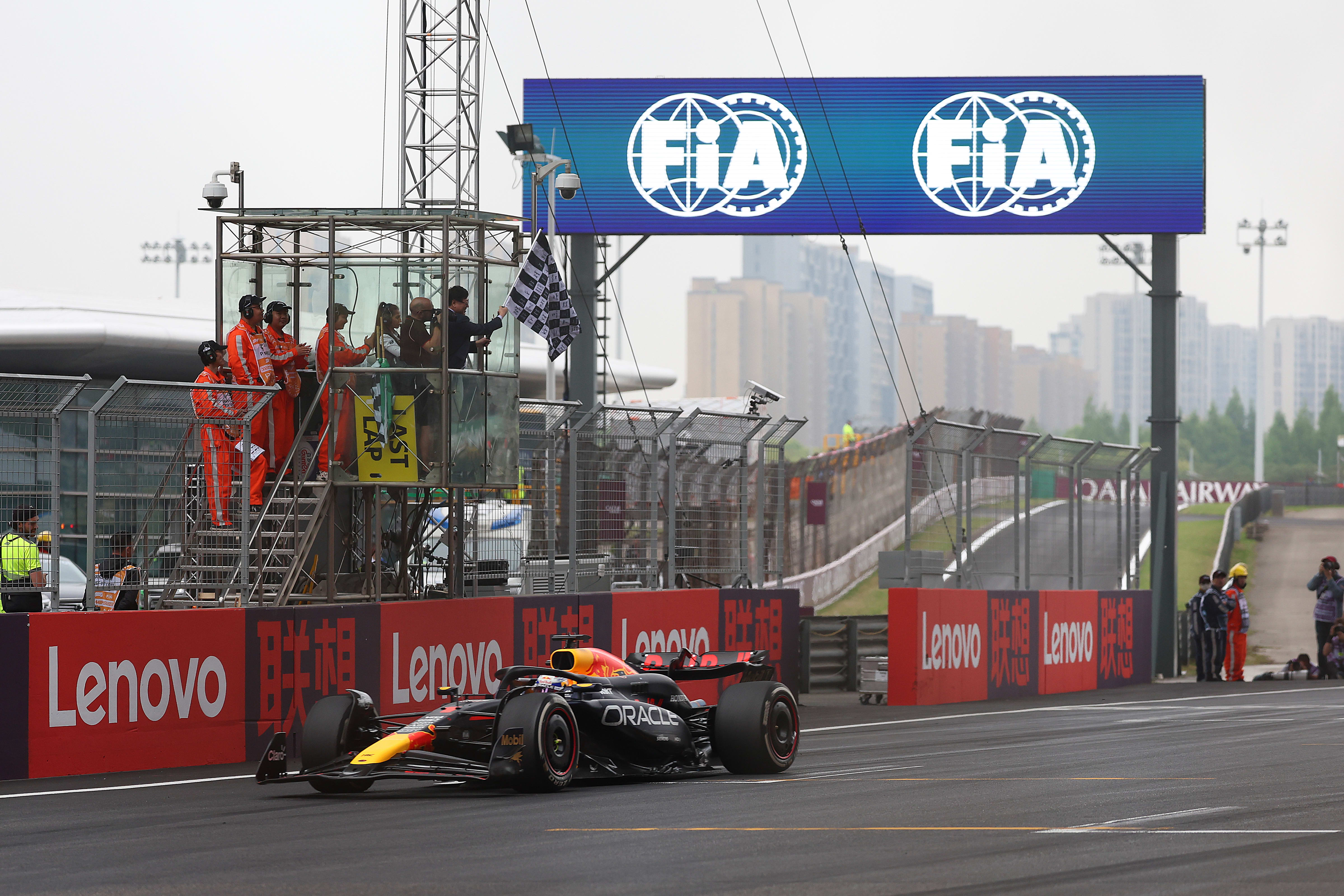 Pole-sitter Max Verstappen won the Chinese Grand Prix for the first time, Oracle Red Bull Racing’s reigning Formula One world champion taking his fourth victory in five Grands Prix to begin the season in a stop-start race paused for two safety cars. From second on the grid, Sergio Pérez finished third for his fourth podium of the year, the team-mates split by Lando Norris after the McLaren driver profited from pitting under safety car conditions.