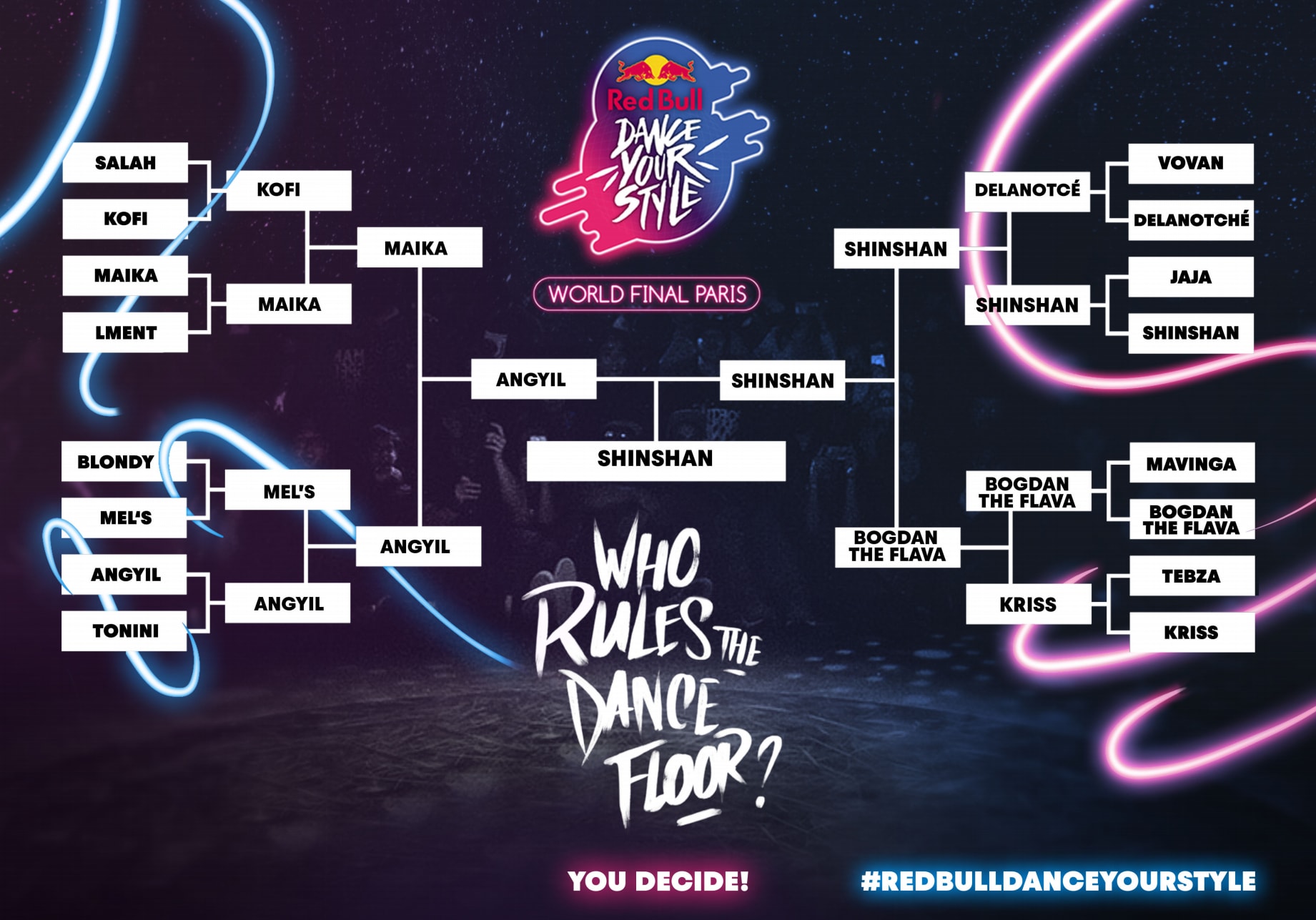 In the final, Angyil, on the red side, brought the heat with an on-point interpretation of the Party Rock Anthem from LMFAO, Can't Hold Us from Macklemore & Ryan Lewis as well as Gala's Freed from Desire. But 17-year-old Shinshan, on the blue side, did not bow down and took risks with his acrobatics while keeping up the party vibe. His moves and warm charisma won the heart of the crowd. Bracelets were raised, tinting La Grand Halle de la Villette in a light blue.
