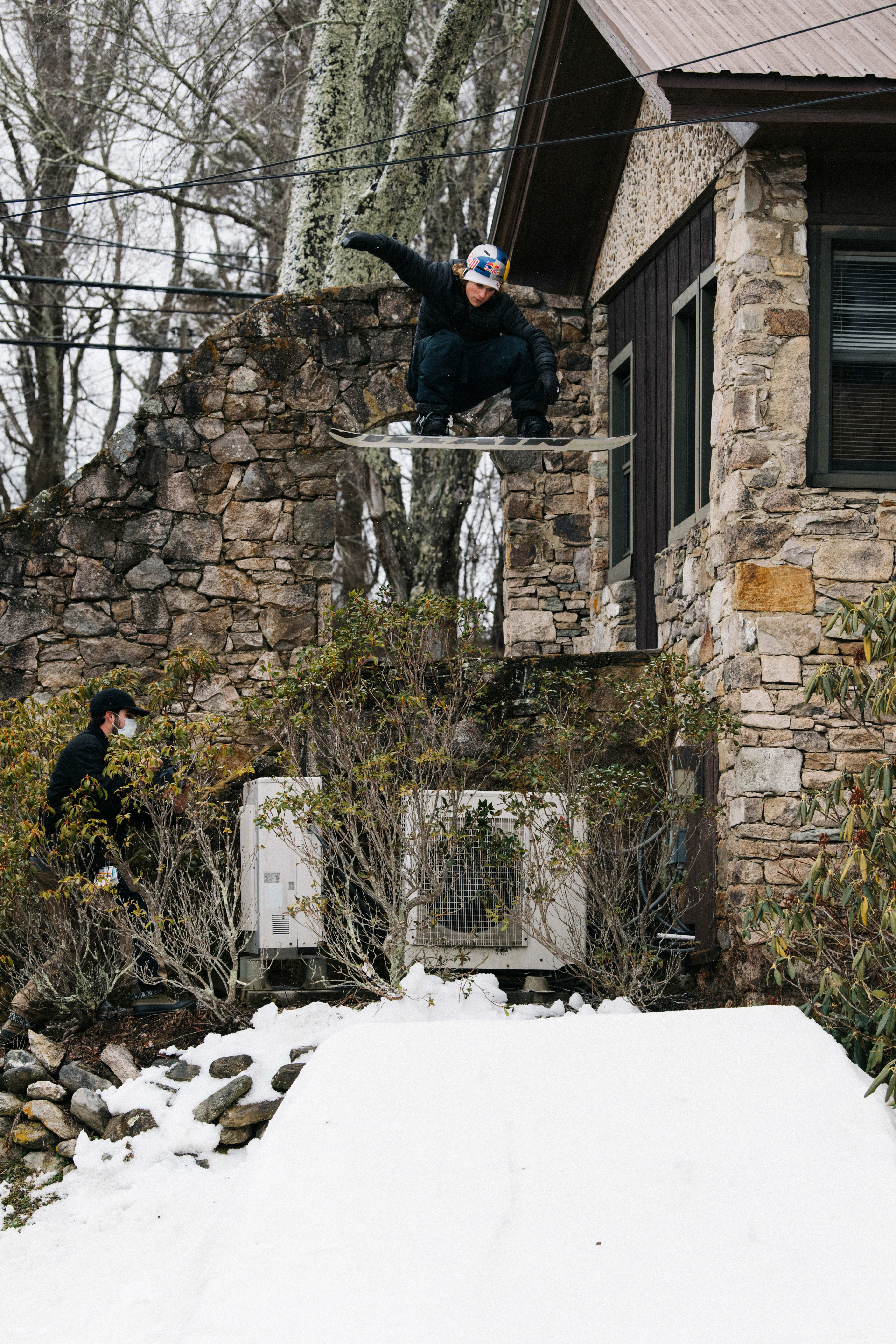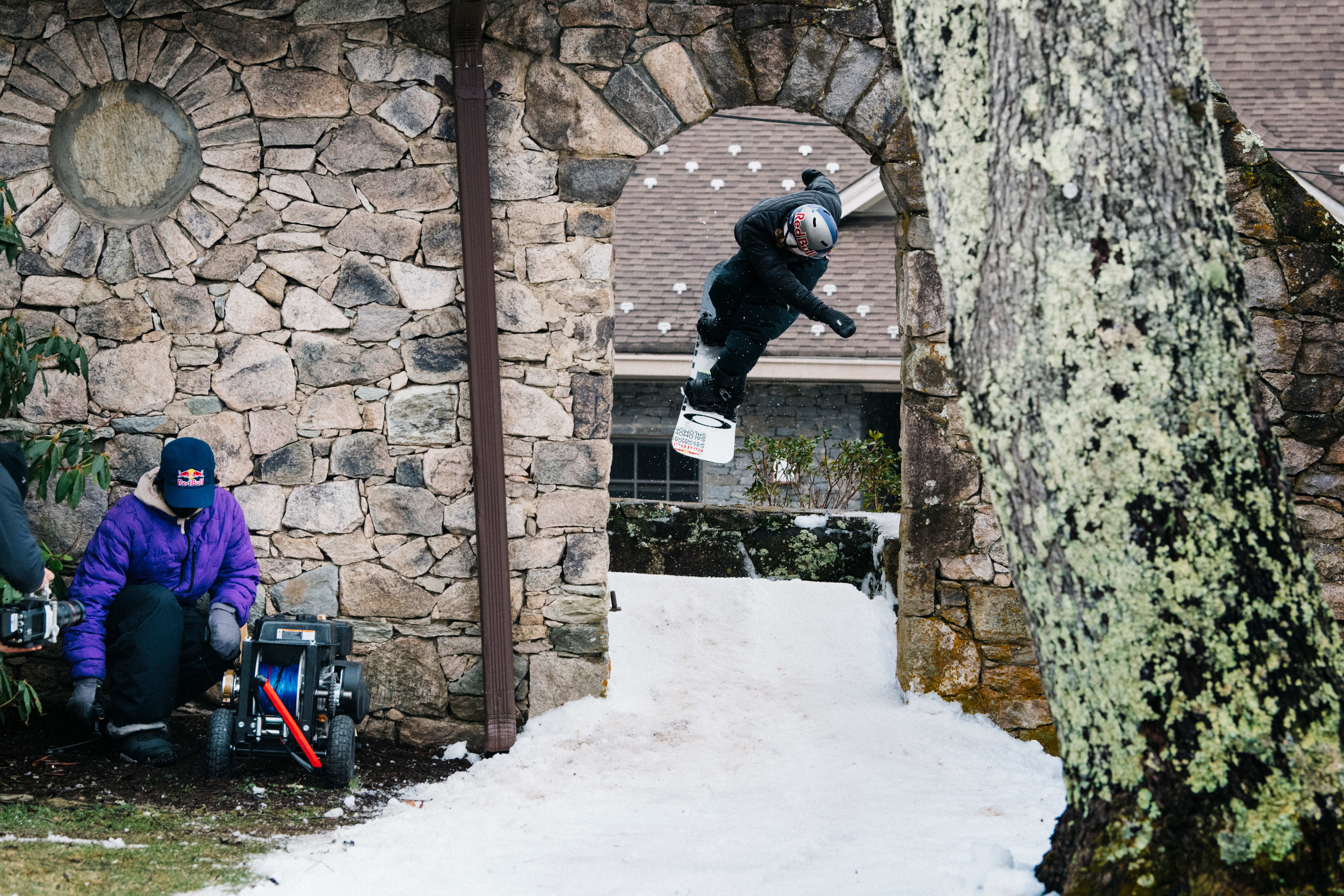 I love those calls… I want to go and do a street or mountain trip in every state in the US… totally would. Getting Luke in his home state with Red Bull and this Rail Report project, just blowing up the fact that he’s a really good snowboarder coming out of Carolina. You can tell he takes so much pride in his home. I’ve shot with Luke for a long time. He’s 400% focused on making a good career in snowboarding. He’s the first dude up, first dude out the door. He found terrain at a number of places [for the shoot], and they settled on Lees-McRae College in Banner Elk, North Caroline. We stayed busy there for three days.