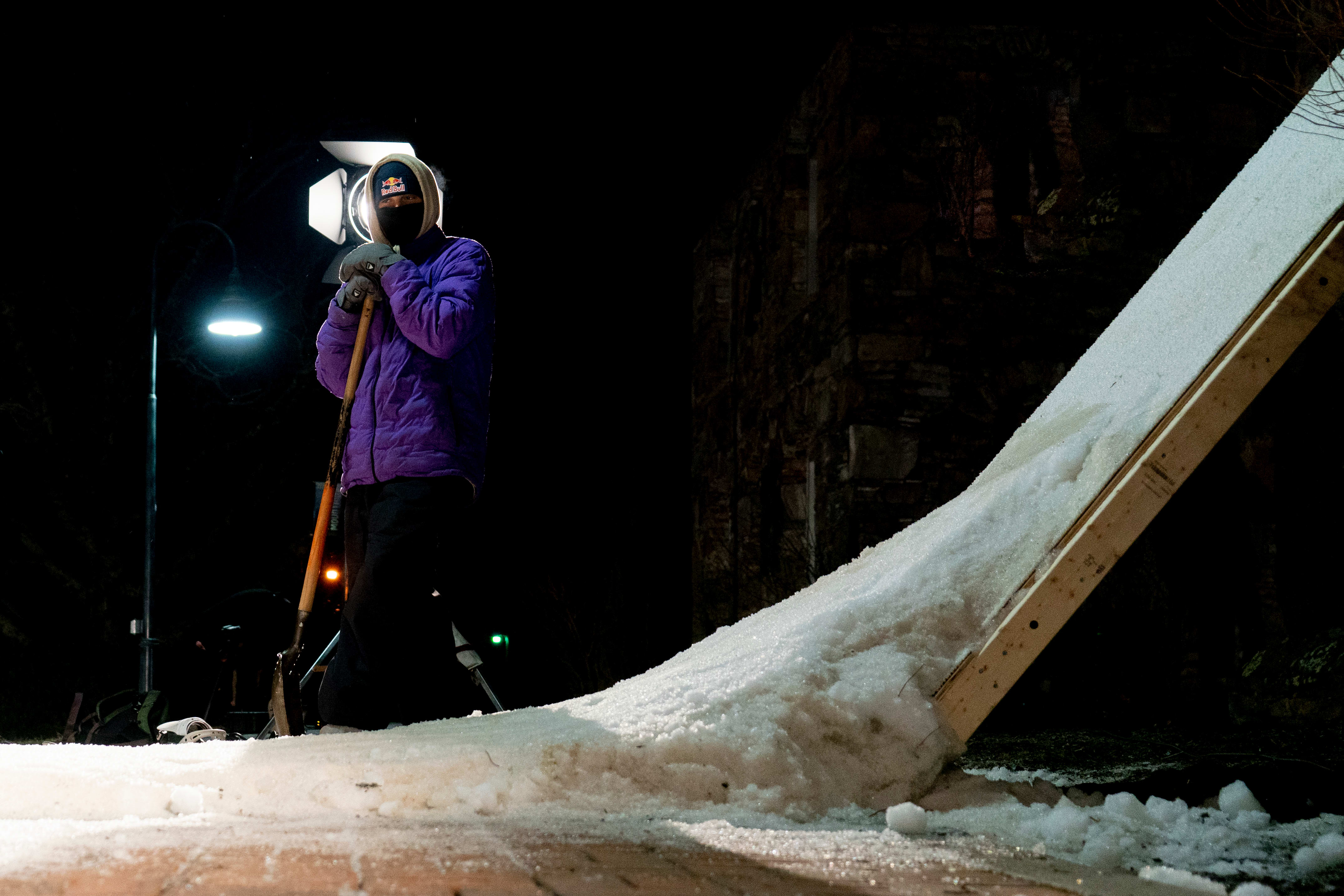 Luke killed it. He’s so good at snowboarding and he really had that on display with Judd [Henkes] and Alex [Caccamo]. Having the support of the Lees-McRae College, they had the whole snowboard club out there so they were helping set up and tear down. The lacrosse team was all housed right where we were doing this long flat rail. They were cranking the music out the window all night asking Luke what he wanted to hear and singing along. It was such good energy. They brought the snow in from Beech Mountain and just made big piles around the campus. Then with Luke’s forward thinking, he hired a park shaper from his home mountain to help set stuff up.