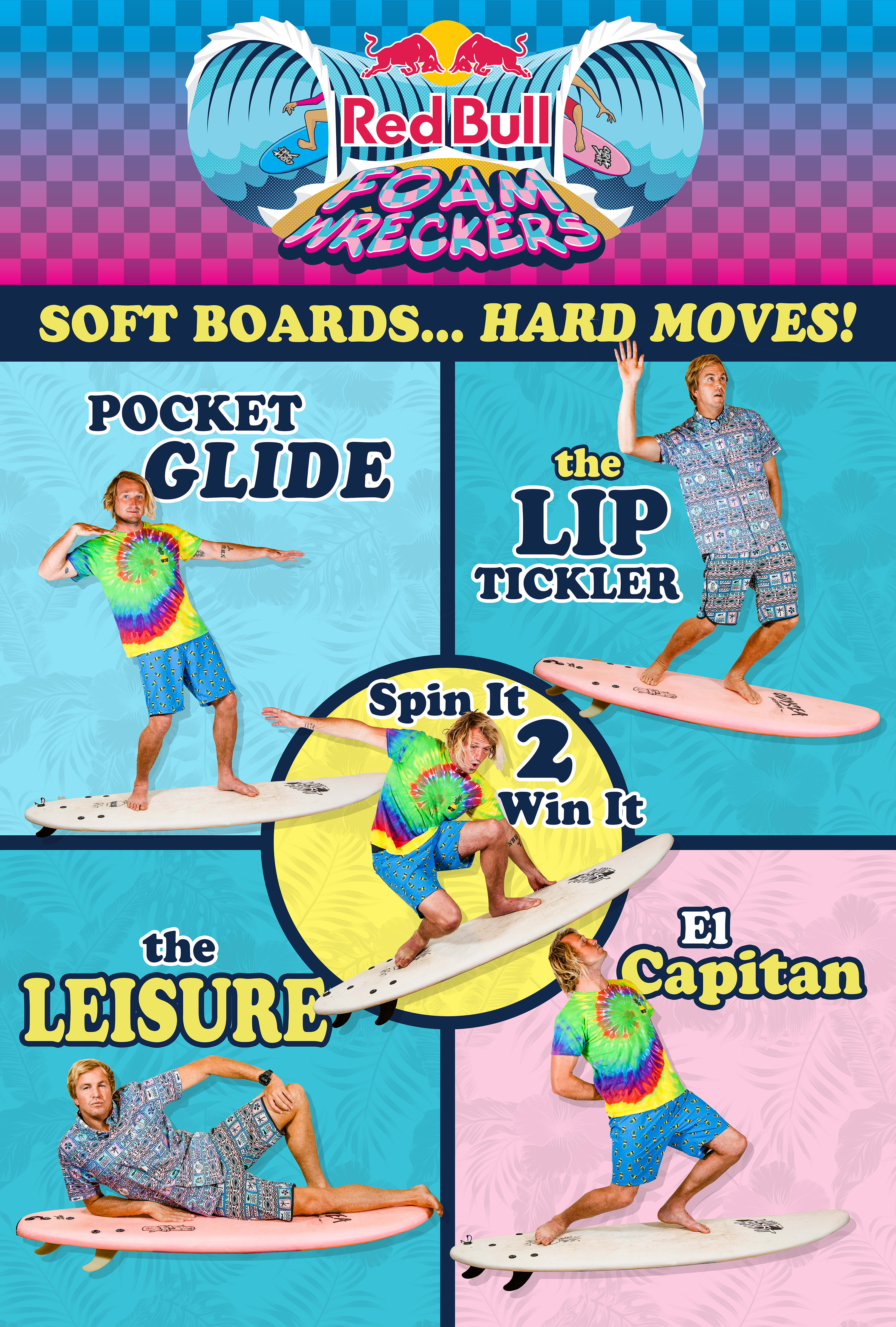 The exact event format for each Red Bull Foam Wreckers event will vary based on the event venue as well as the waves/conditions available on that day of competition. Before your “heat” you will spin the “Wheel of Shred” to determine which Catch Surf soft-board model you’re going to RIP on. You’ll paddle out with 6-10 of your closest (new) friends all on different soft-boards and proceed to stake your claim as the most “unique” soft-board surfer of the next 15 minutes.