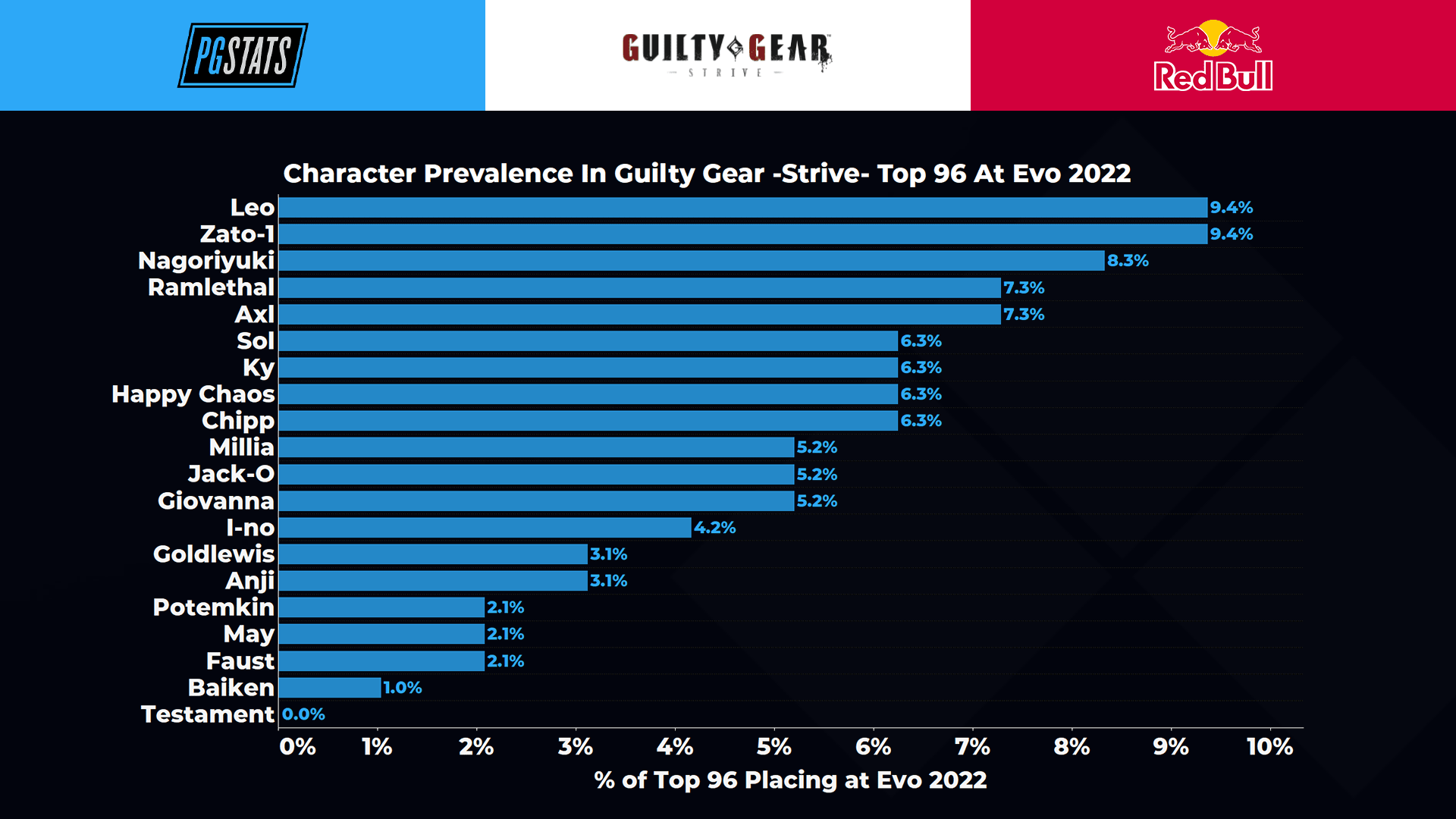With 2,158 competitors, the Evo 2022 bracket more than doubled the size of the previous largest offline -Strive- tournament, the de facto Season 1 finale at COMBO BREAKER 2022, which fielded a bracket of 1,056 players, and nearly quadrupled the field at the next largest major of Season 2, June’s CEO 2022. Our analyses of the previous events stopped at Top 64; this time, with a larger event, we’ll go another round deeper into losers bracket and take a look at the character selections from the Top 96 players: