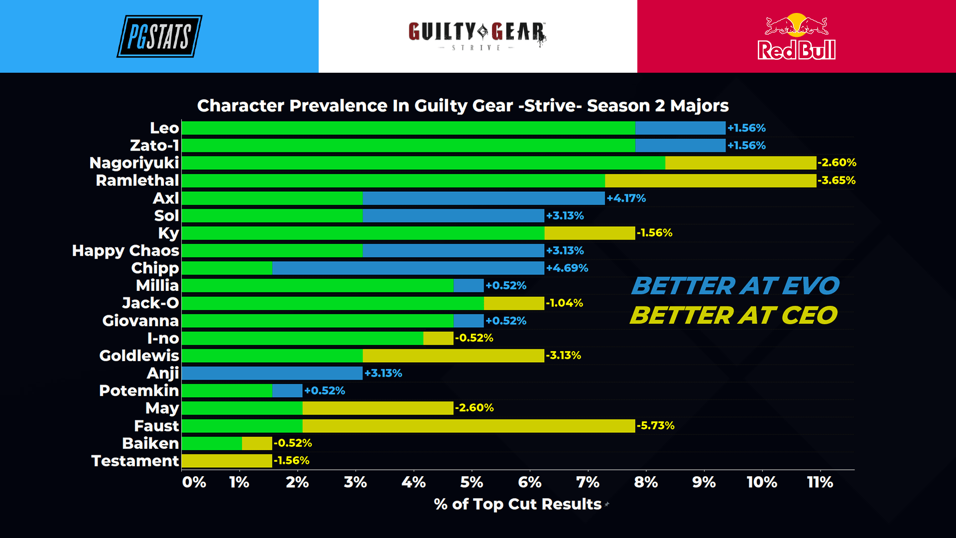 Six characters stood out above the rest at CEO 2022: Nagoriyuki, Ramlethal, Zato-1, Leo, Ky, and Faust. Of those, the first five continued to perform well at Evo, all placing at least six representatives in Top 96, with Leo leading the pack at 10.