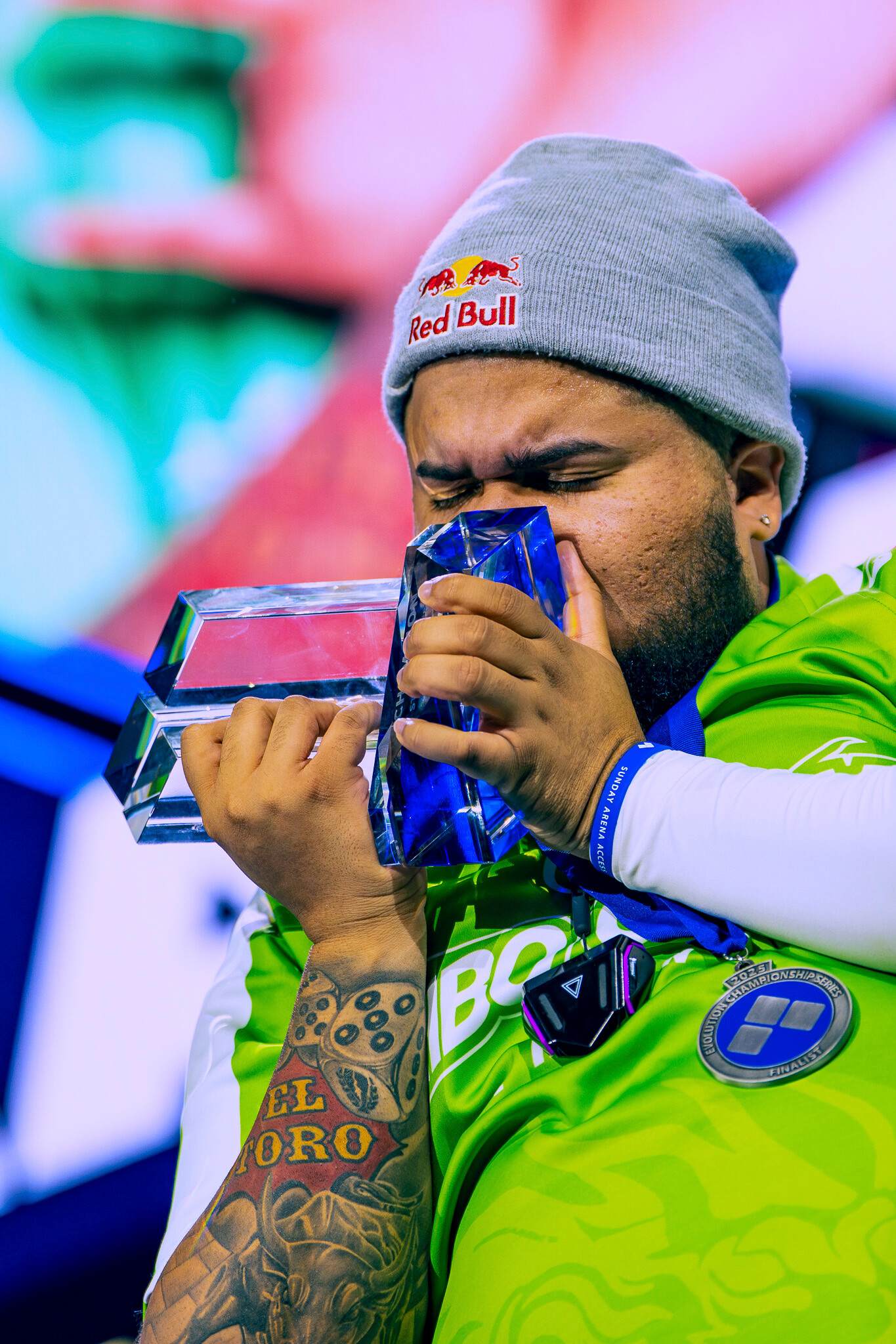 MenaRD kisses his championship trophy after his Street Fighter 6 Grand Final win at EVO Championship Series in Las Vegas, Nevada, USA on August 3, 2025