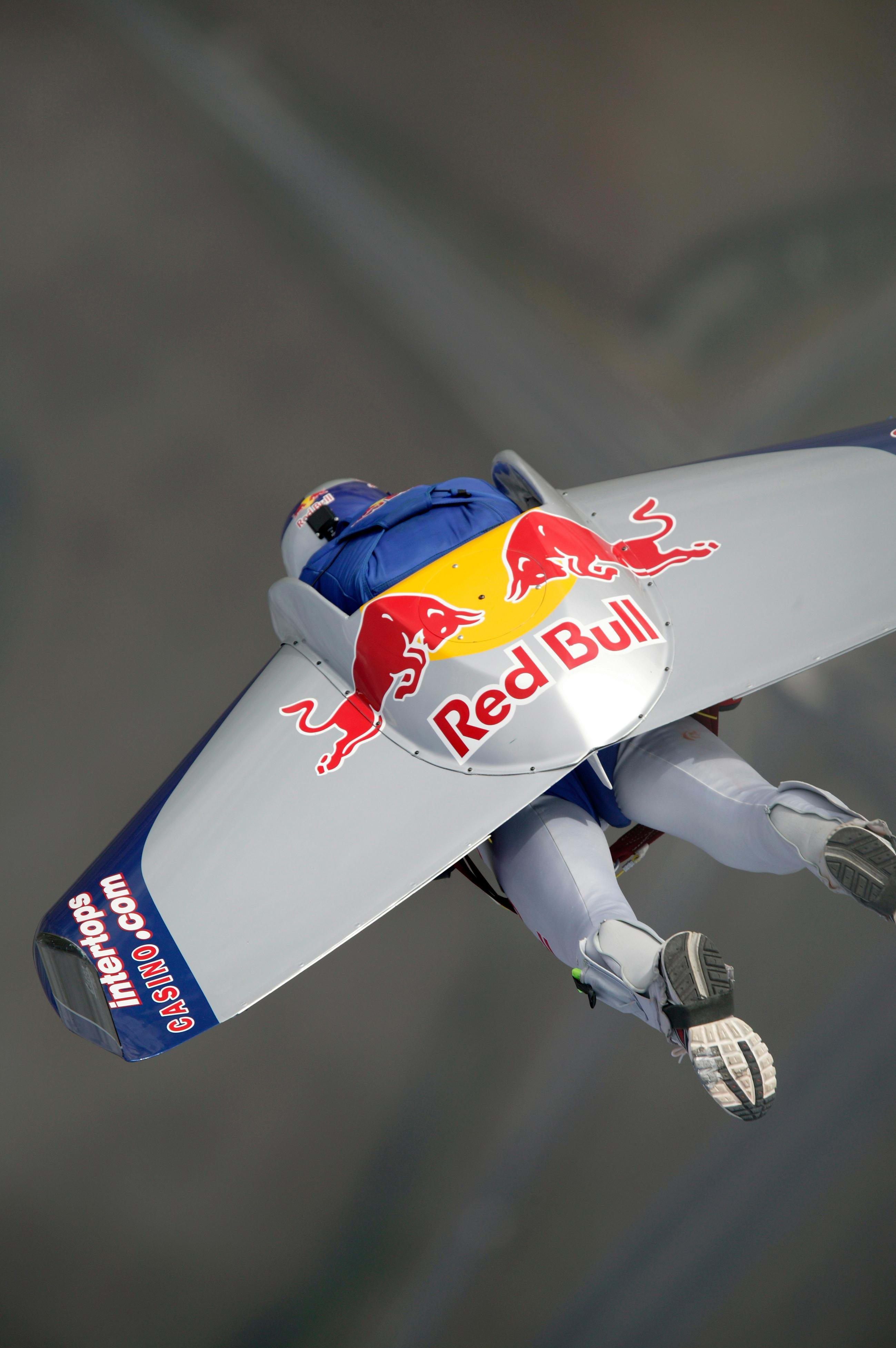 Felix Baumgartner in his flying suit as he becomes the first flying human being to cross the English Channel.