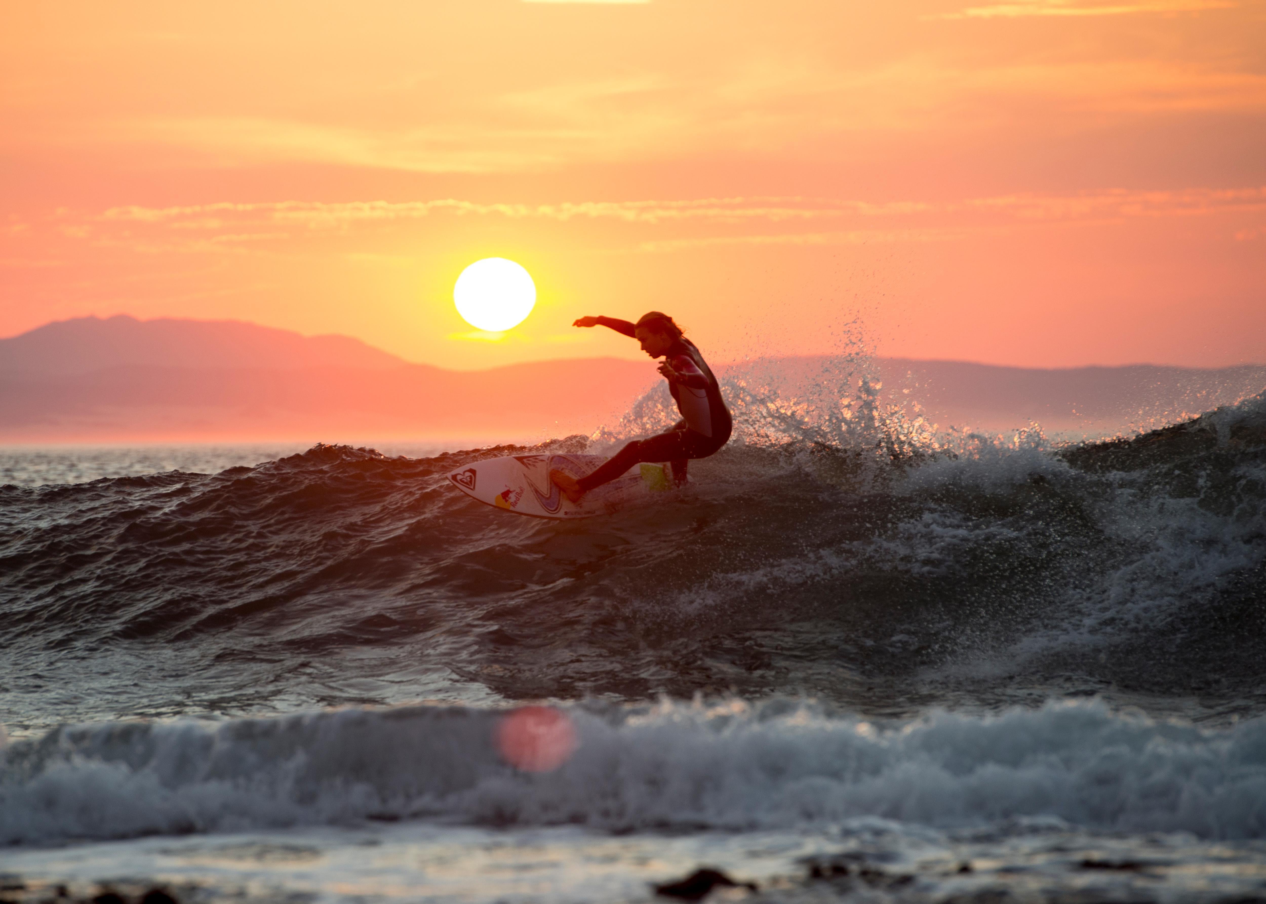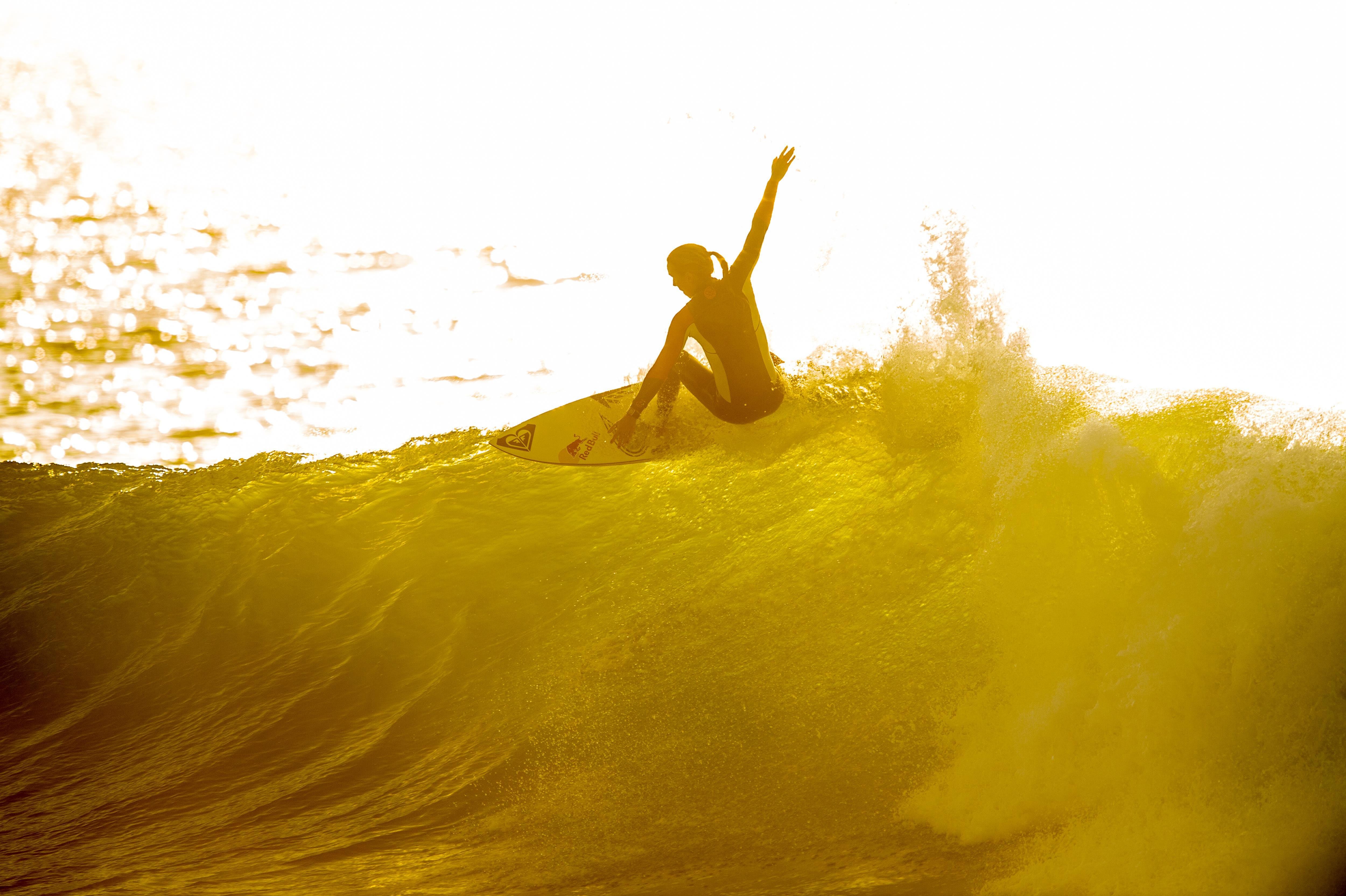 Sally Fitzgibbons surfing at sunset