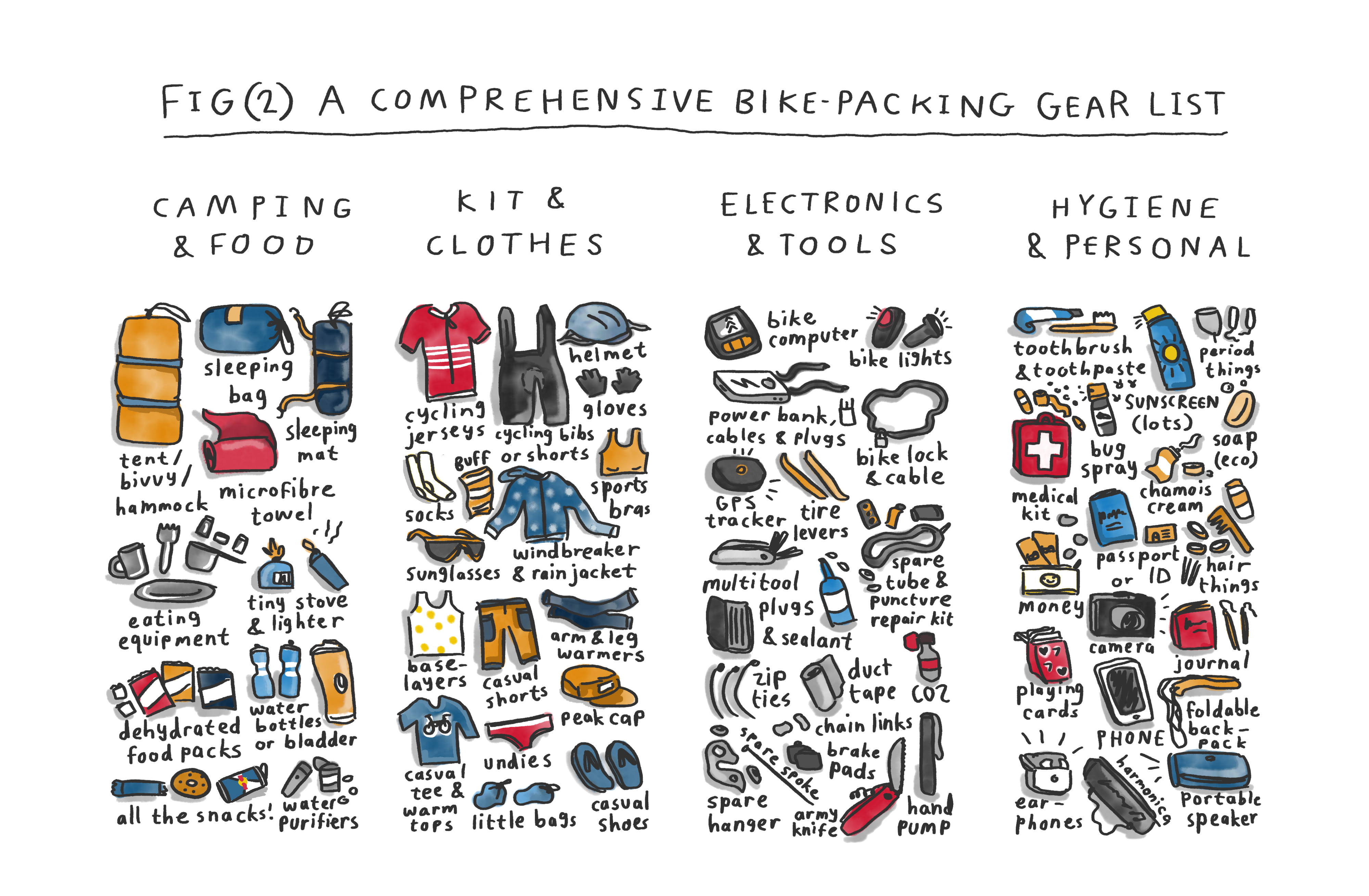 - Bike accessories, tools and spares: a bike computer with navigational capacity is a key piece of gear on a gravel bikepacking trip, as well as a front light, a rear light and potentially a GPS tracker. You’ll need chargers and charging cables for all of these things, as well as a power bank. You’ll also want to carry tools to fix a puncture, maintain your bike and MacGyver your way through any other challenges. Think: a multitool, tyre levers, a hand pump, a spare tube, plugs, sealant, chain lube, a pocket knife, duct tape, some string and some cable ties. You can add things like a spare derailleur hanger, spokes or chain links if you’ve got the mechanical skills to use them.