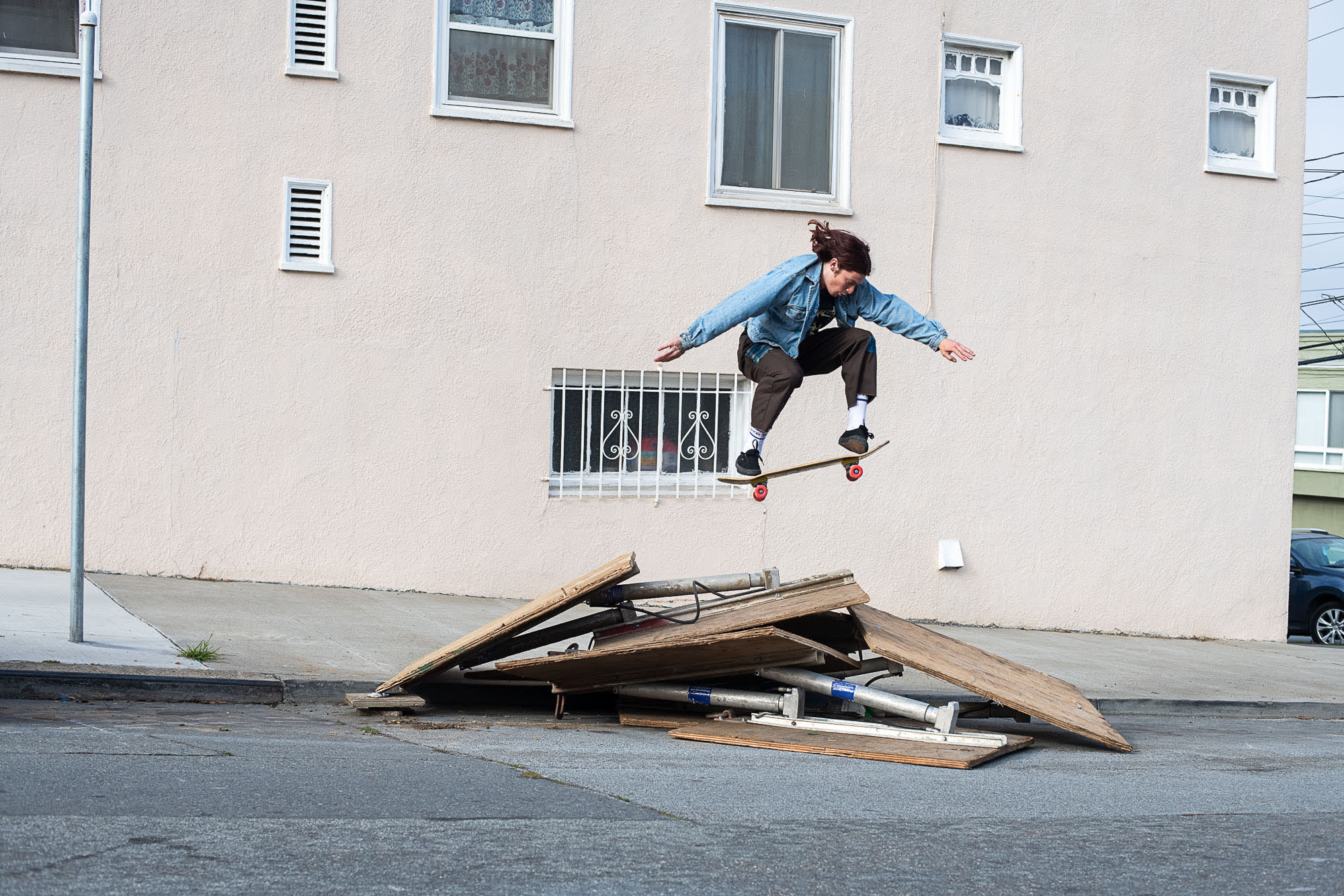 Mack grew up in Boise, Idaho and moved to San Francisco around the same time as Otto. “I didn't want to live in a place where it's 100 degrees in the summer and zero degrees in the winter,” Mack says. “I just packed up my truck and put a mattress in the back. I lived in that for the first six months. I just wanted to skate and film.” Today, Mack works for Deluxe distribution as one of their videographers and editors. But like most skaters who make the move to The City, in the beginning, the hills took some getting used to. “Right when I first moved, I was bombing this hill in North Beach and a car was in the intersection and kind of slowed down. So I was dragging my foot at first and then had to jump and slide over the hood. And then my camera bag kind of flipped me around and I just landed on my ass. I was fine, but I'm sure it looked super crazy.”
