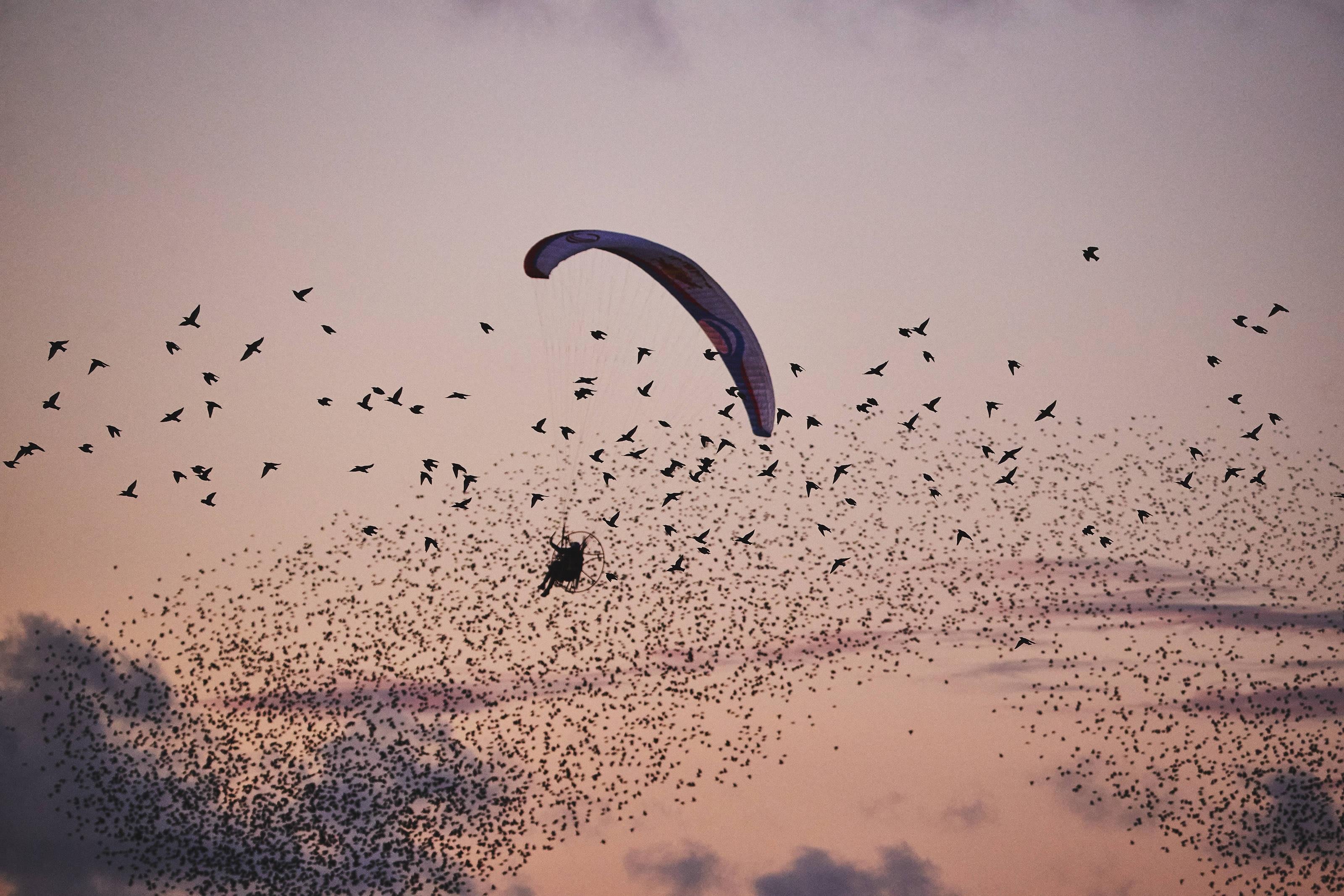 With an electric-powered paraglider Llorens was able to fly among the starlings and experience being so close to a flock of birds.