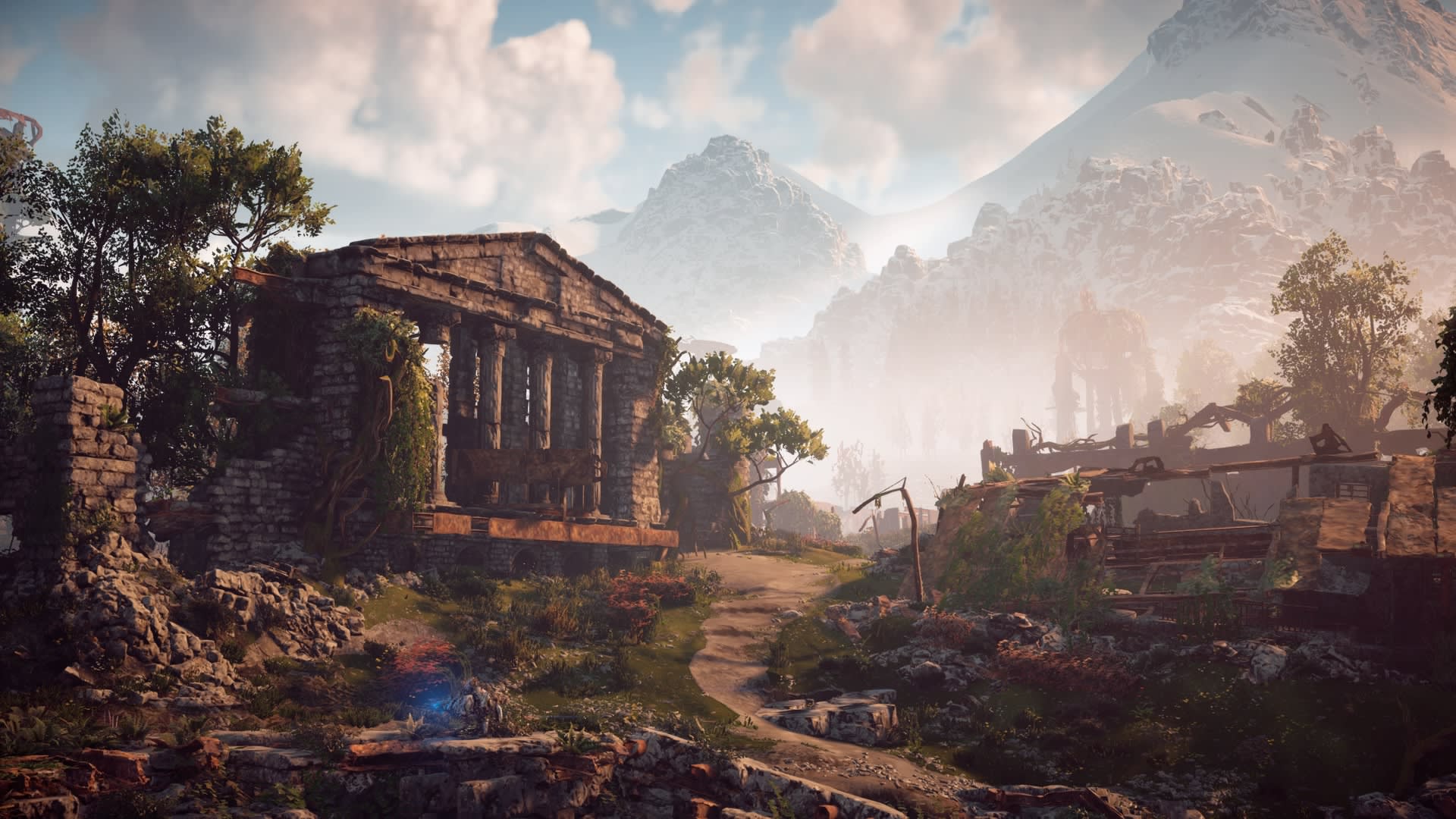 This location is a ruined city that has a Tallneck roaming around. Despite the rural remains, there’s a lot of greenery scattered around, including many trees that block out areas from the sun and create some dynamic lighting and shadows within the area. While it’s good to get some shots of the mechanical beasts that linger around the area, the Tallneck you see walking can make any picture look majestic.