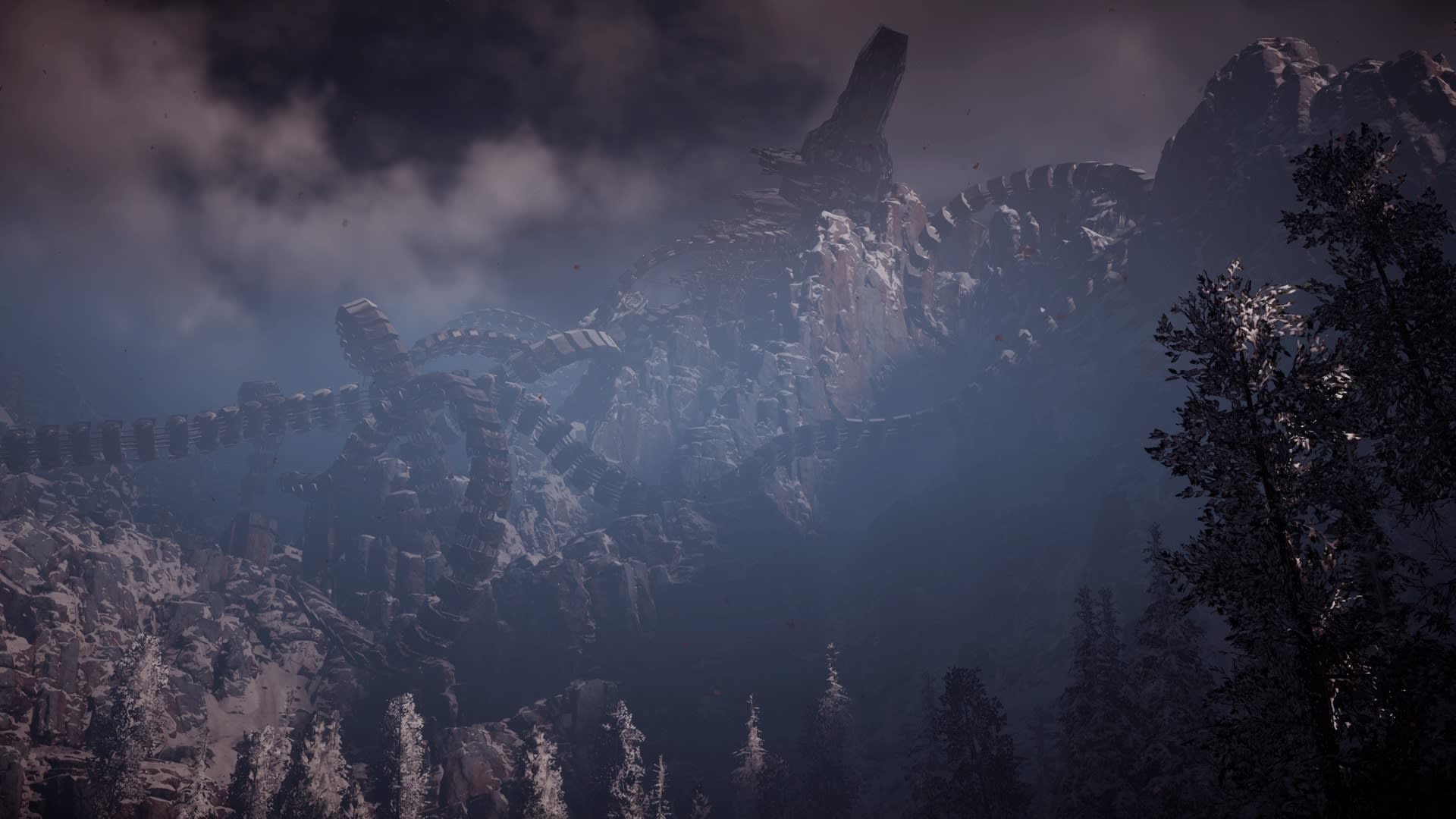 In the most northern part of the map, high up in the mountains, is the Grave-Hoard. The snow falling down isn’t the only thing that makes this location cold. Here you’ll find the eerie remains of the Metal Devil in a snowy grave. Not only can you look over a large amount of land in the shadow of the mountain, but the gigantic, twisted tentacles of the Metal Devil give a very moody and intimidating vibe.