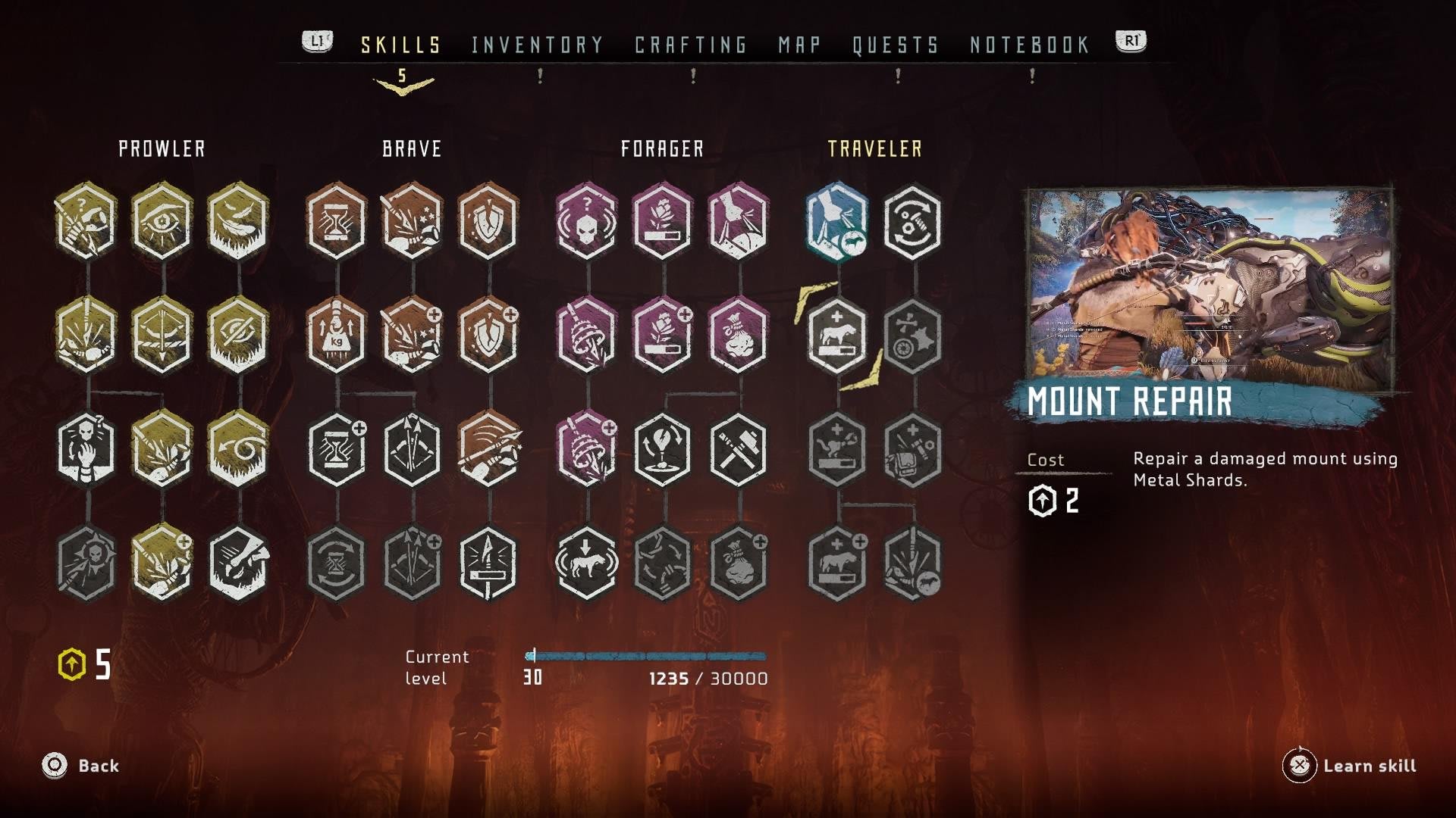 The Frozen Wilds introduces a whole new set of abilities to learn as part of the traveller skill tree. These mostly focus on mounted interactions and let you do things like pick up items while on machines and repair broken Striders and Broadheads using metal shards. Put some time into levelling up this ability. It makes getting around the map far simpler and will ensure you always have a mount to escape on.