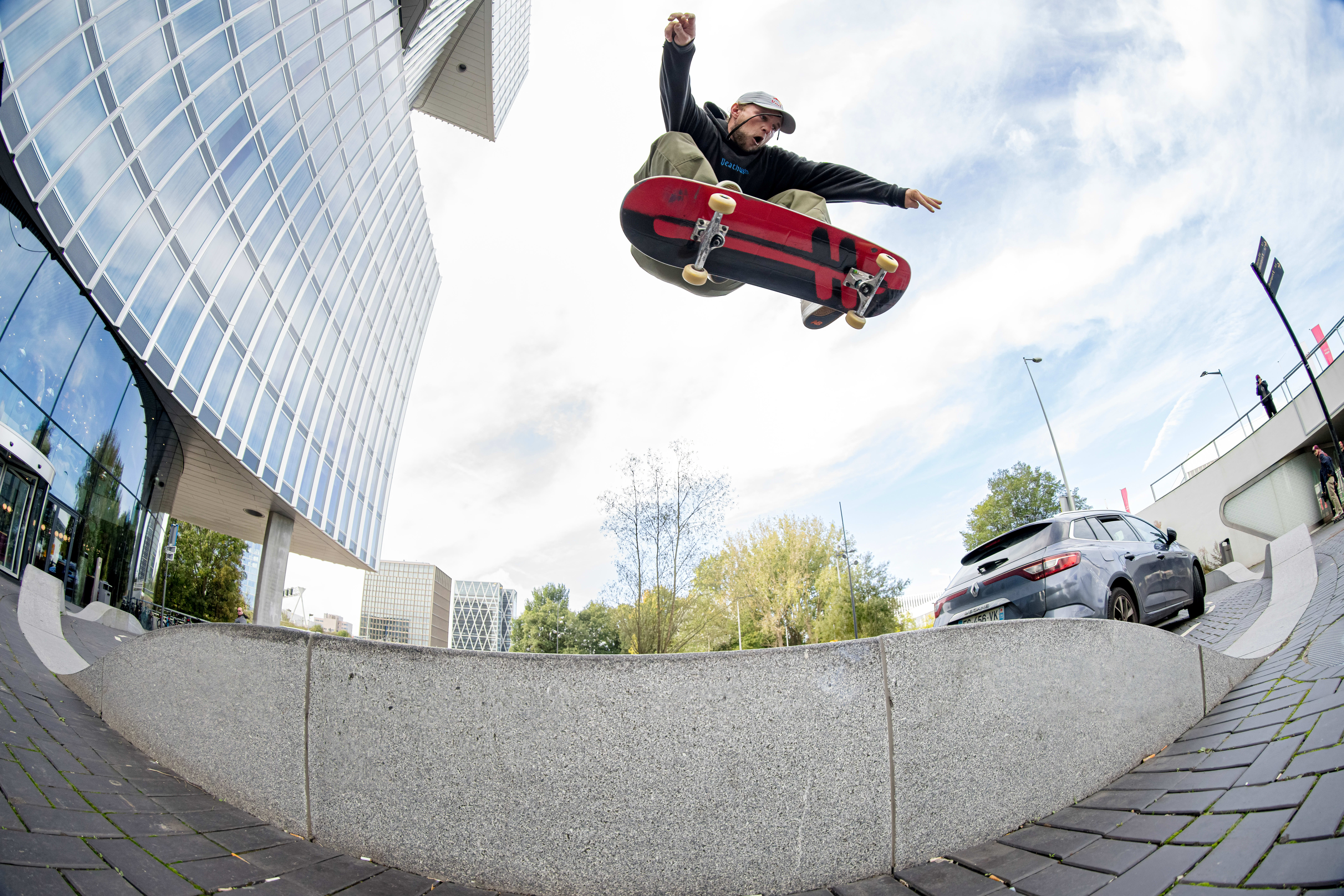 Jamie Foy does a pop shove it at Red Bull Drop In Tour in Amsterdam in 2022