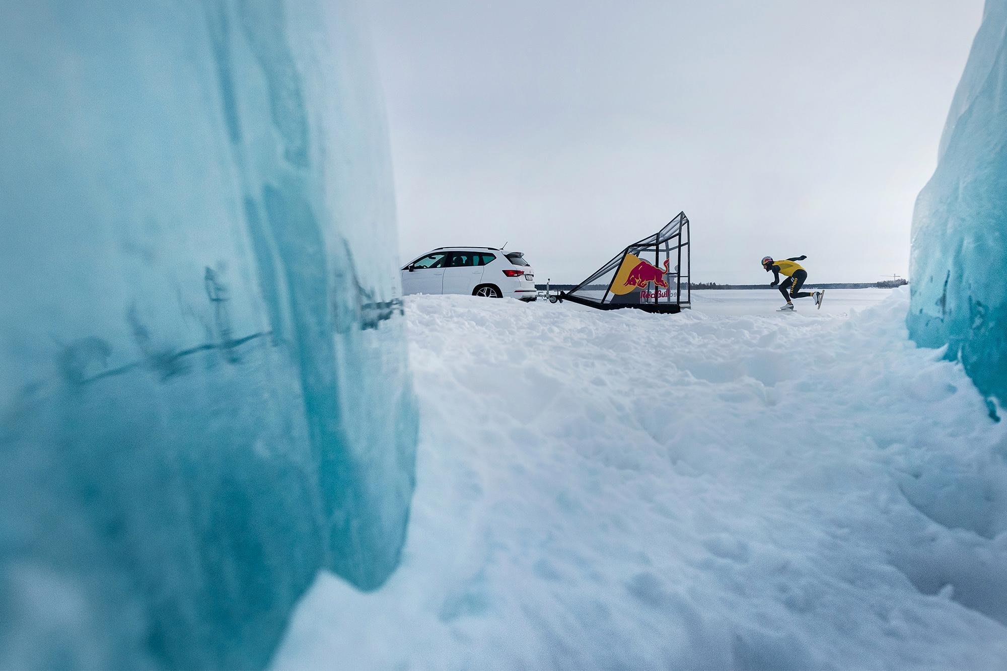 Kjeld had just won two Olympic medals and now he wanted to become the fastest speed skater ever. Together with Erben Wennemars, Red Bull studied the ideal conditions to reach the top speed. Part of these studies was a test in a wind tunnel to calculate in detail how the aeroshield should be designed. Wennemars also studied the speed that could be reached behind the aeroshield on normal skates at a deserted Twente airport.
