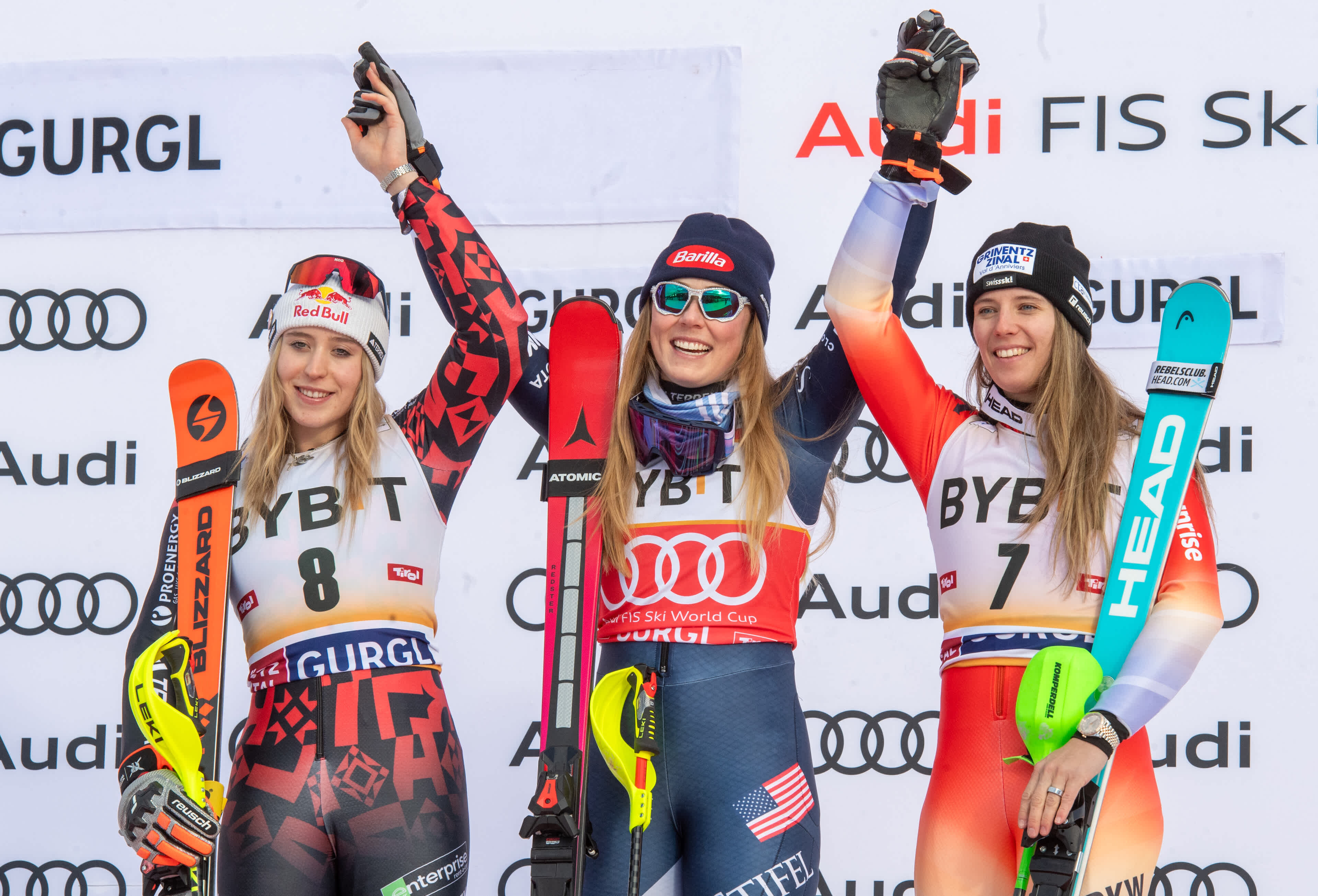 Podium finishers: Lara Colturi, Mikaela Shiffrin and Camille Rast