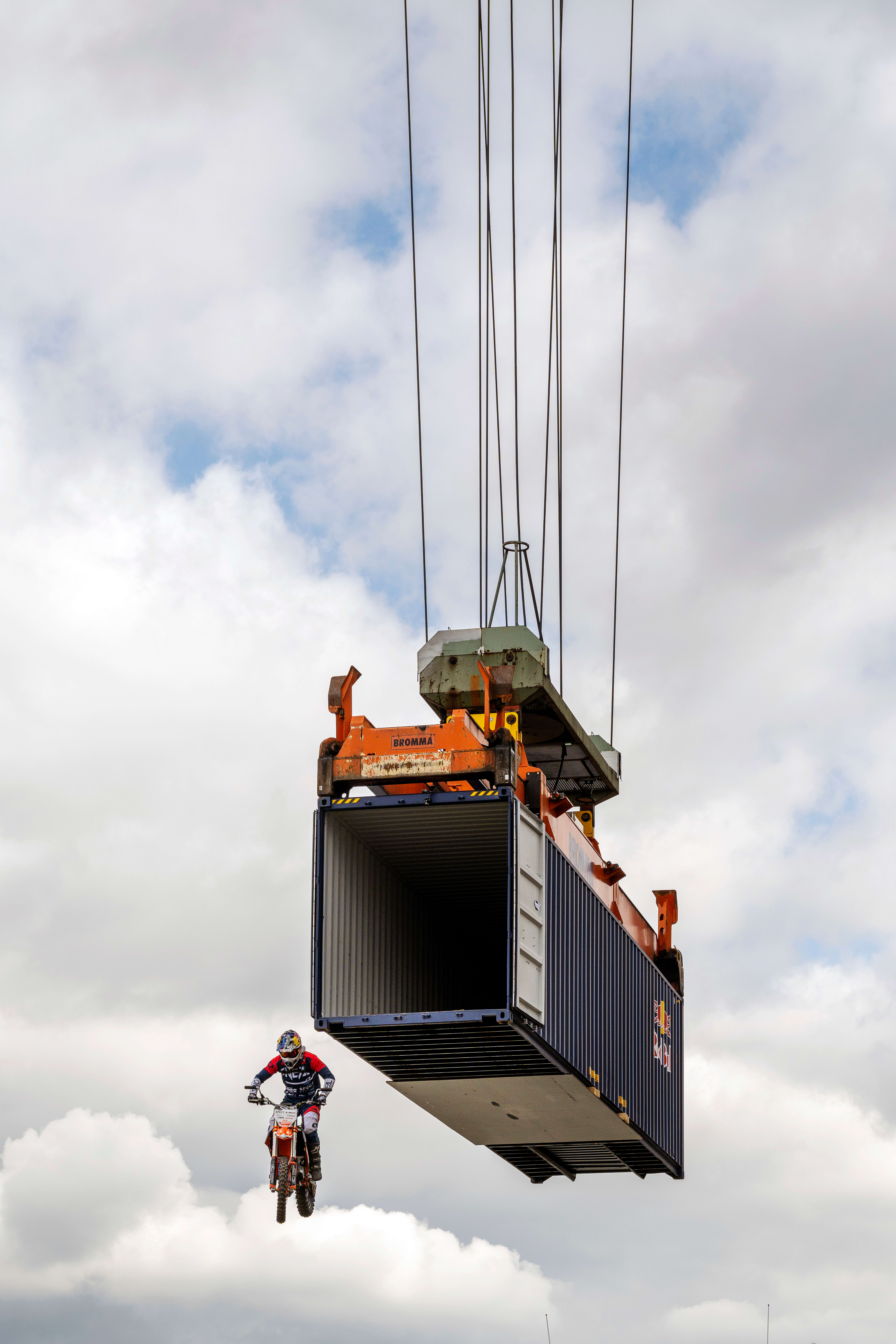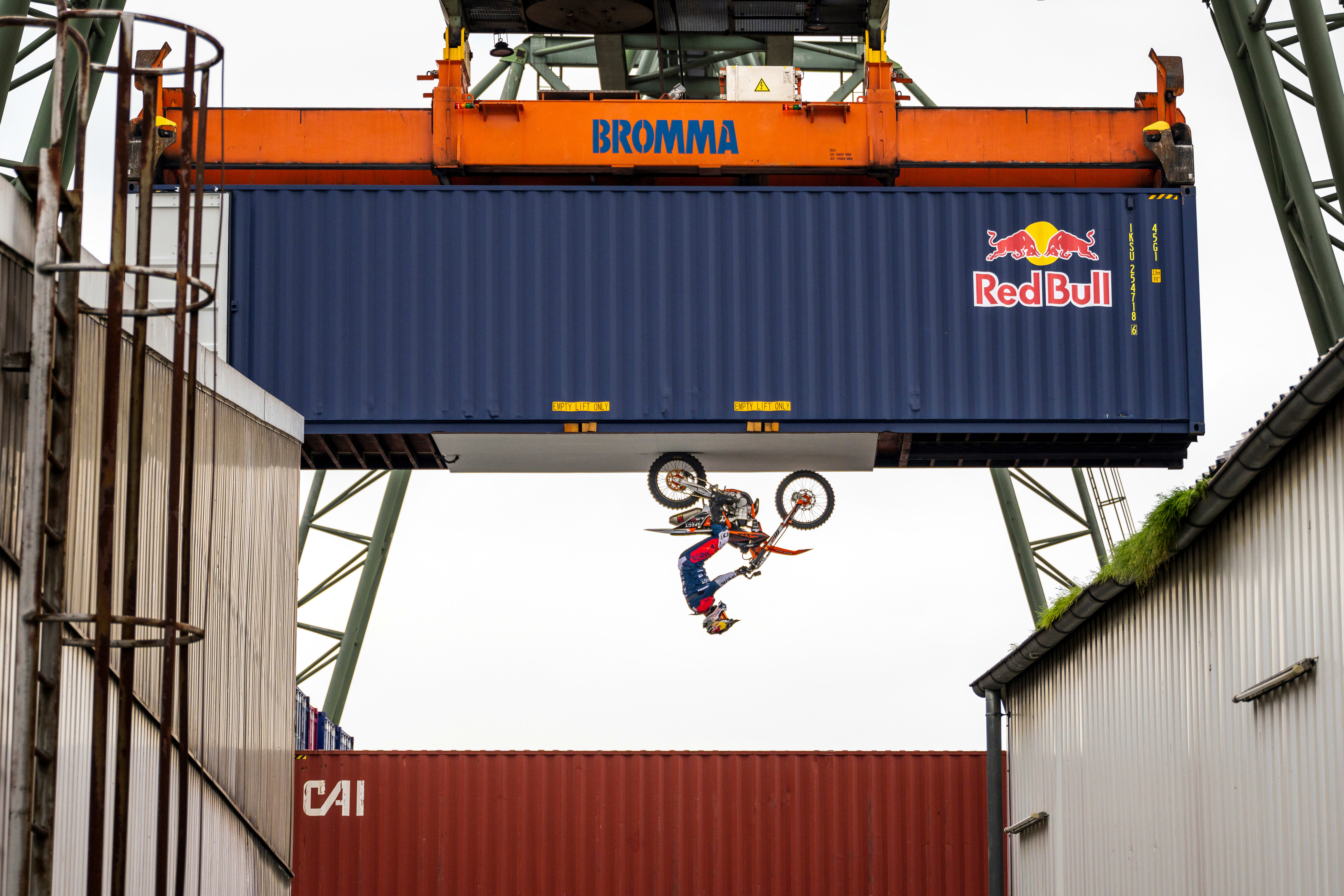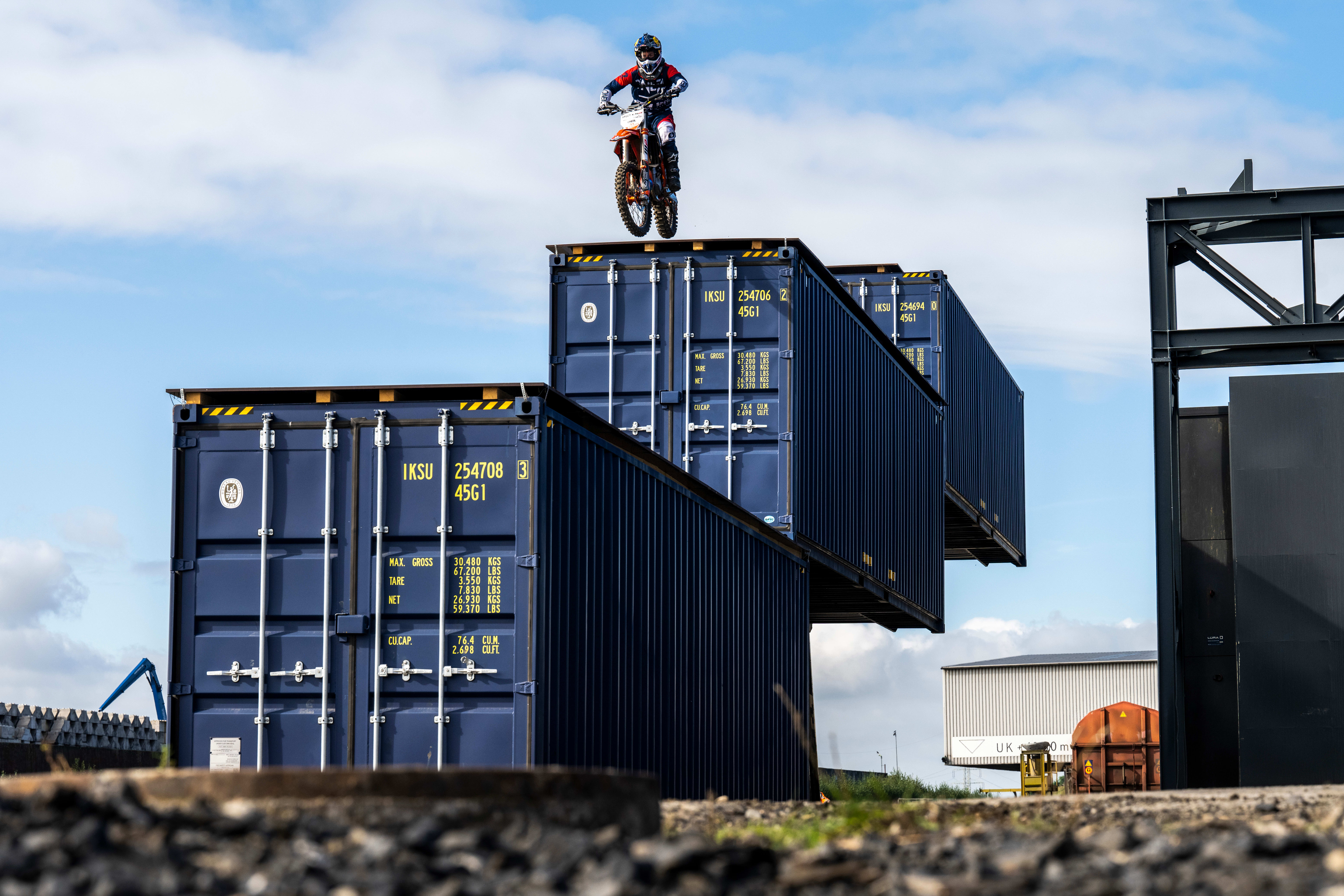 FMX pros often have to pull off a landing, but this Drop was especially challenging. Ackermann was launching from inside a container and then dropping down 10m almost vertically into the bottom of a barge. Revving his KTM deep inside the container, Ackermann has a very restricted view and no line of site to his landing spot. It’s a leap of faith. Add to the equation that Ackermann isn’t crazy about heights – you can see the tension etched on his face in the behind-scenes video – and you have another astounding trick.
