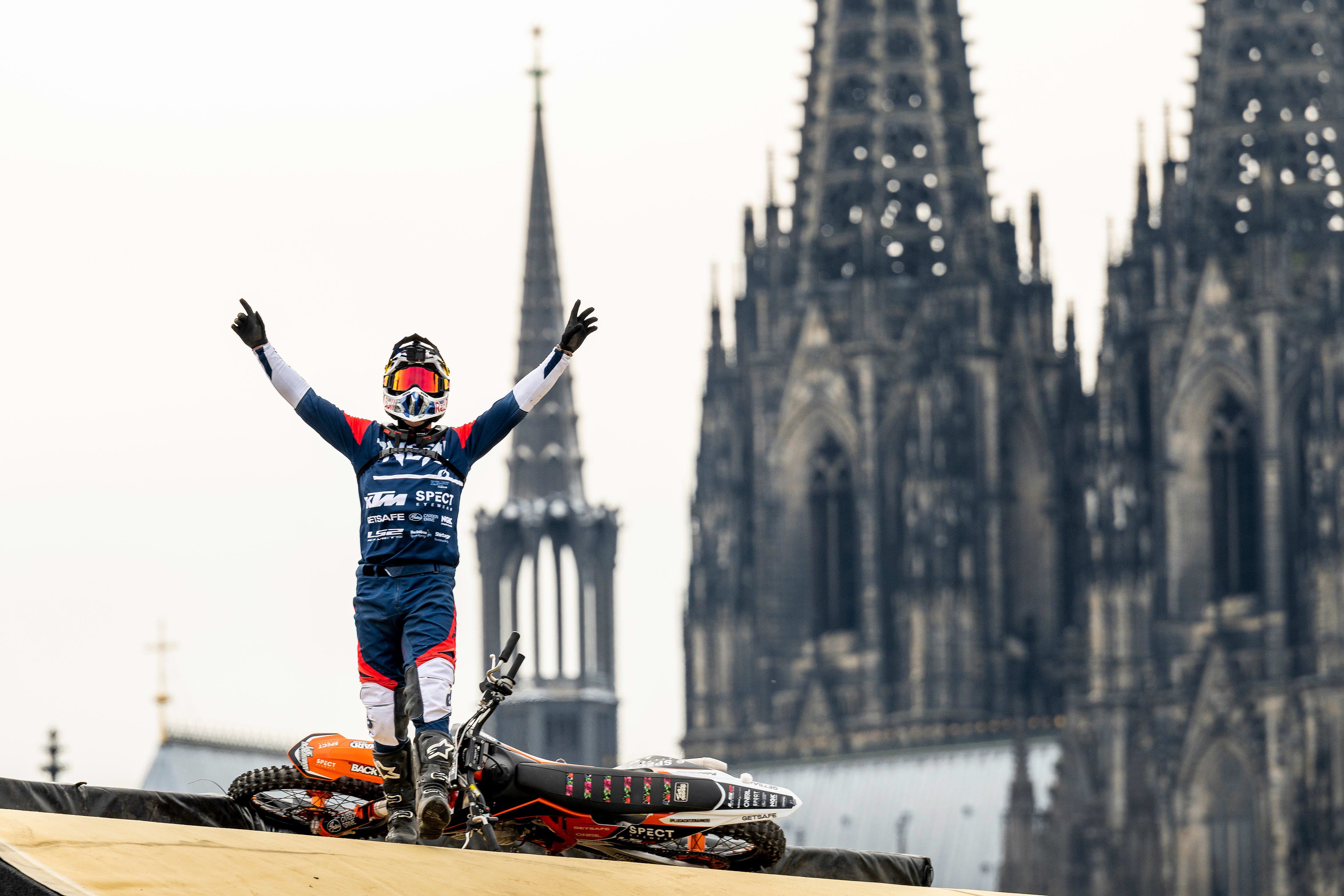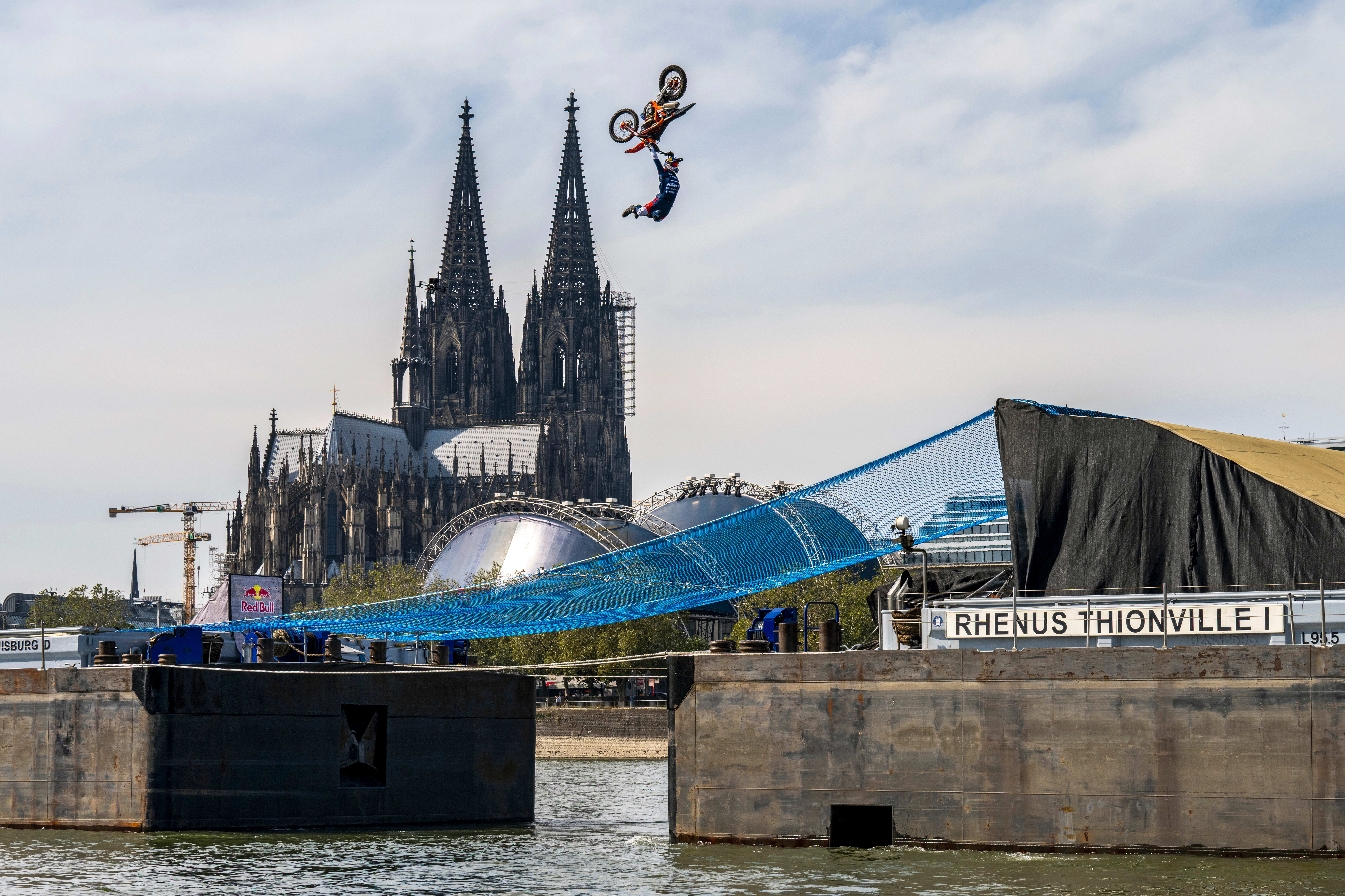 And finally, the signature part of the clip sees Ackermann jump ship, leaping from one massive barge to another as they sail past Gothic Cologne Cathedral. For the jump, Ackermann performs a Tsunami backflip, powering his KTM 25m into the air and dangling from the handlebars of his upside-down bike as it flies through the air. The trick is complicated because the huge barges are far from stable as they bob up and down on the Rhine – and they need to be kept a steady distance apart so that Ackermann lands in the right place.