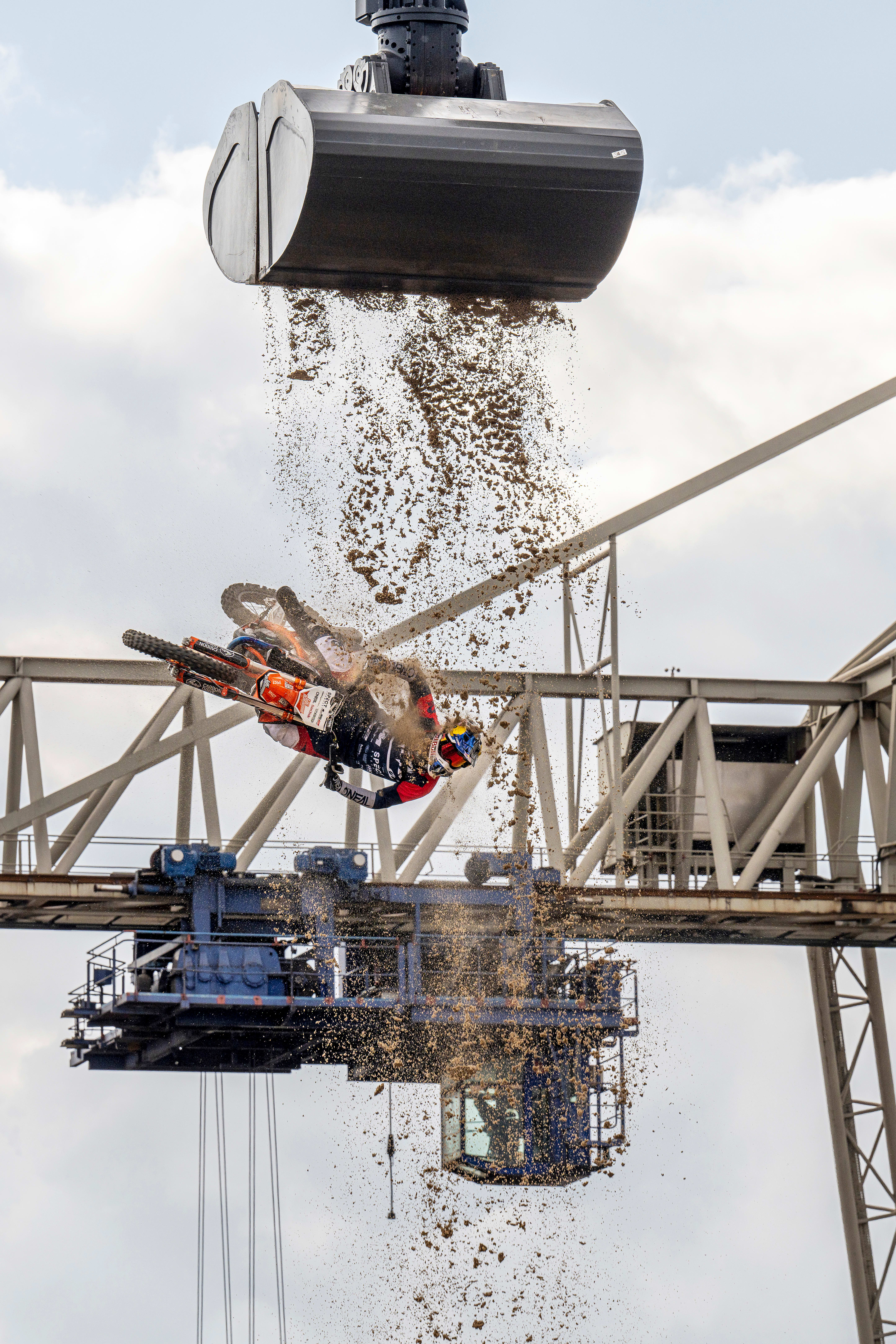 Dwarfed by the huge cranes and containers, Ackermann produces another world premiere with the Sand Curtain – a 360 through a cascade of sand with no ramp. A handful of FMX riders worldwide have mastered the 360 – a complete sideways turn with the motorcycle angled parallel to the ground. Ackermann is a master of the trick, but the sand is a new twist. Dropping from an excavator shovel 15m above the ground, Ackermann has to perform the 360 while he and his bike are showered with sand. “The sand got everywhere,” said Ackermann after the shoot. “It even managed to seep down the back of my trouser into my underpants.”