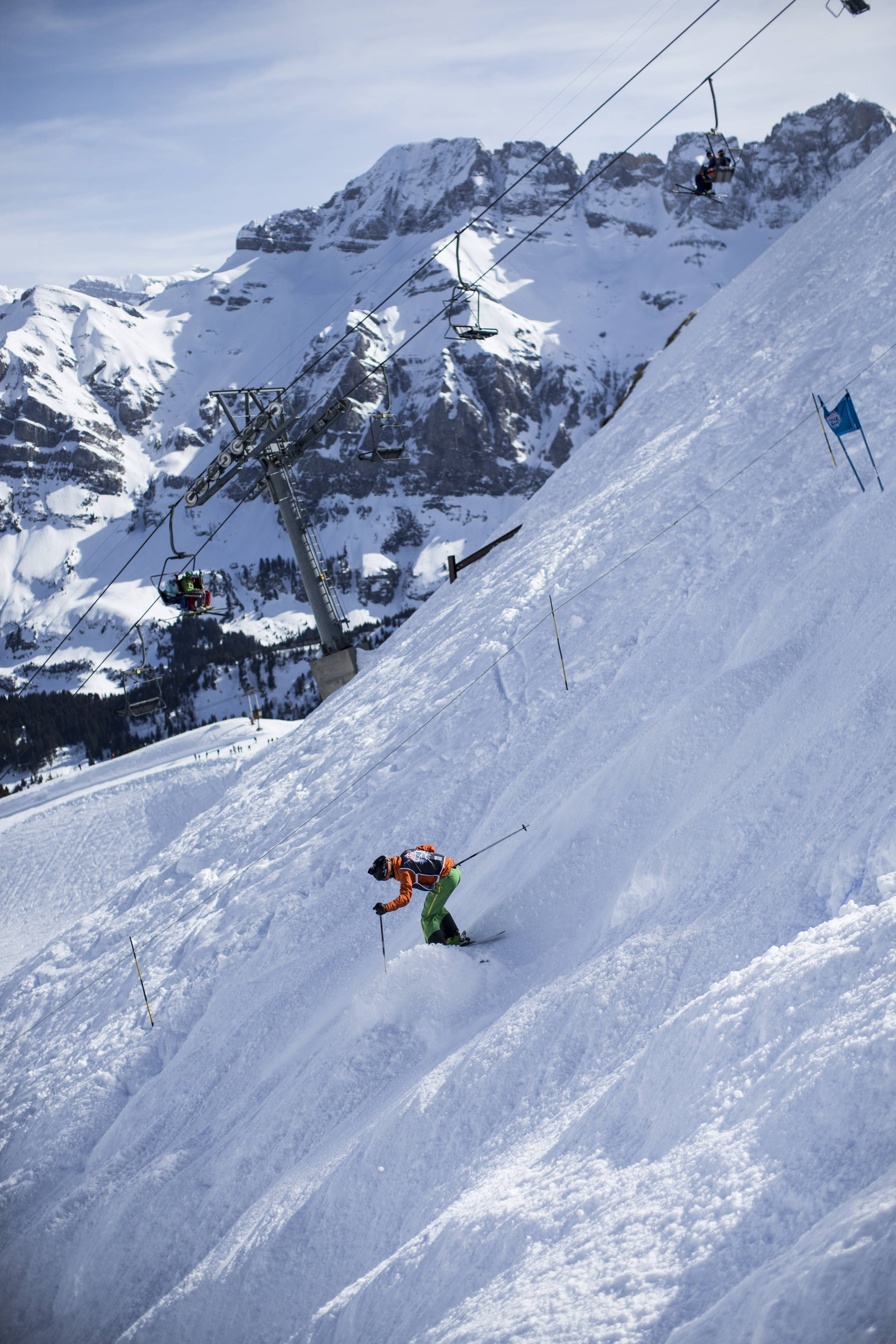 If you've never seen a mogul competition before, it goes like this: skiers take it in turns to race down a dedicated slope, navigating or utilizing bumps of snow – moguls – from which they can launch jumps and collect points.