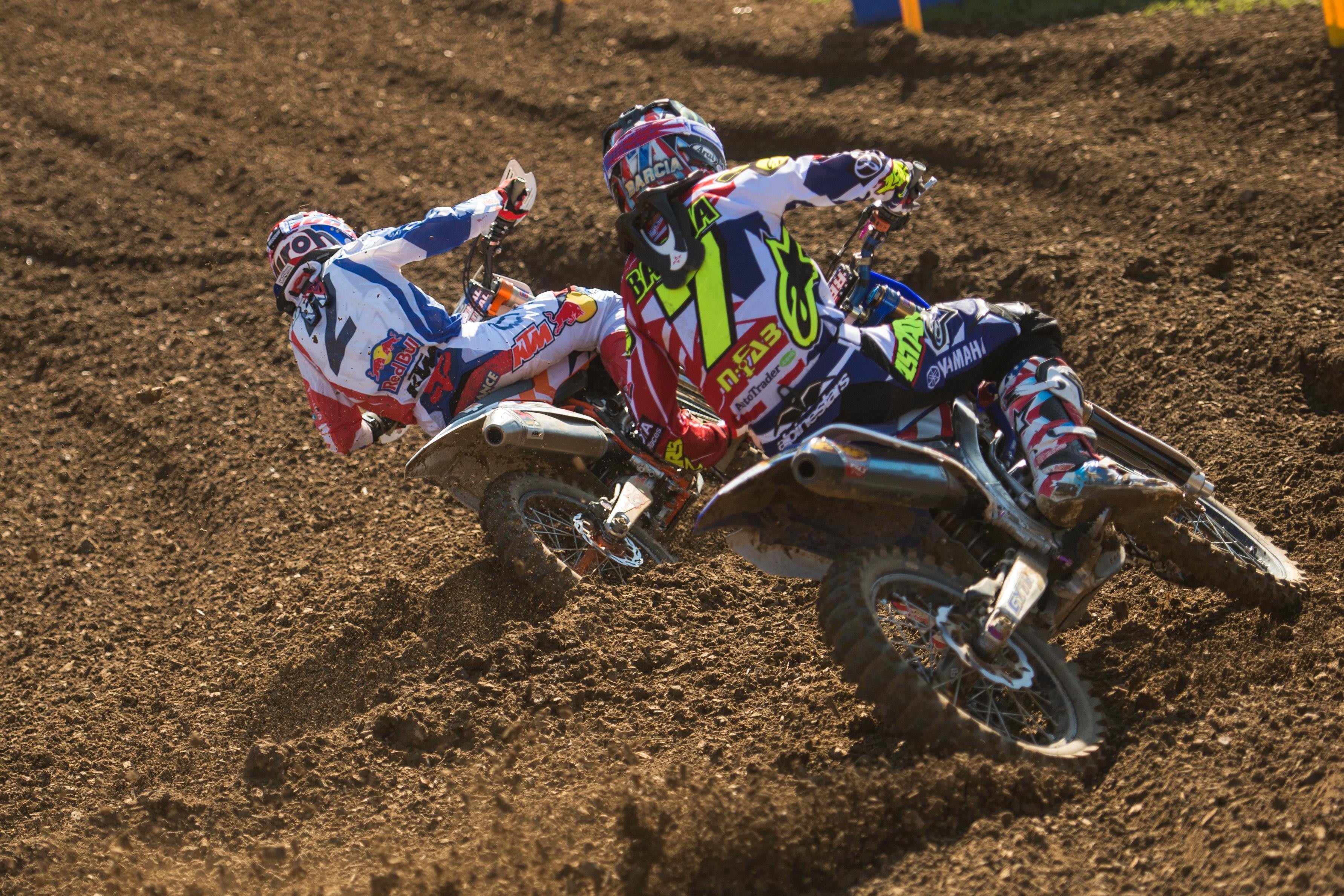 Behind him, his French teammate Gautier Paulin had lost the front end in a fast sweeper, and was desperately trying to make up ground. Barcia’s USA teammate, the 250-mounted Jeremy Martin, was almost as impressive as Musquin, coming from a start outside the top 15 all the way to fifth by moto’s end. Musquin chased down Barcia, and the two duked it out in an exciting battle, passing back and forth before Musquin eventually became crossed up on a rutted jump landing and hit the ground. He would remount for a fourth, but with Barcia winning and Martin fifth, compared with Musquin’s fourth and Paulin’s eventual seventh, suddenly Team USA was in the driver’s seat.