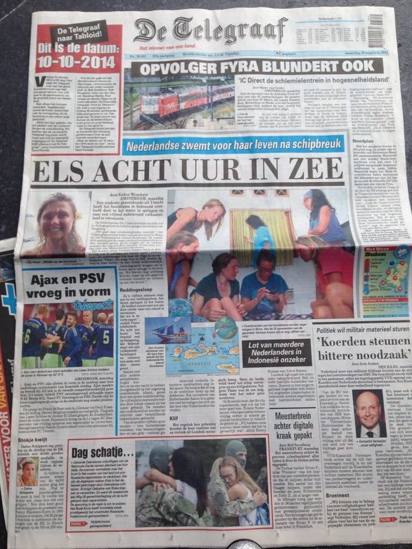 There was one other girl from Germany who came to me and said, ‘Oh Els are you going?’ and I said, ‘We are’ and she swam back and got her friend and they came with us. It was kind of an impulse. Once we’d taken that decision we went for it. We didn’t say goodbye to the rest we just started swimming and swimming and swimming, on our backs, with our faces in the sun. I was still really cold and I needed the sun on my face to stay warm. I had my arms folded across my life jackets and I was making leg strokes.
