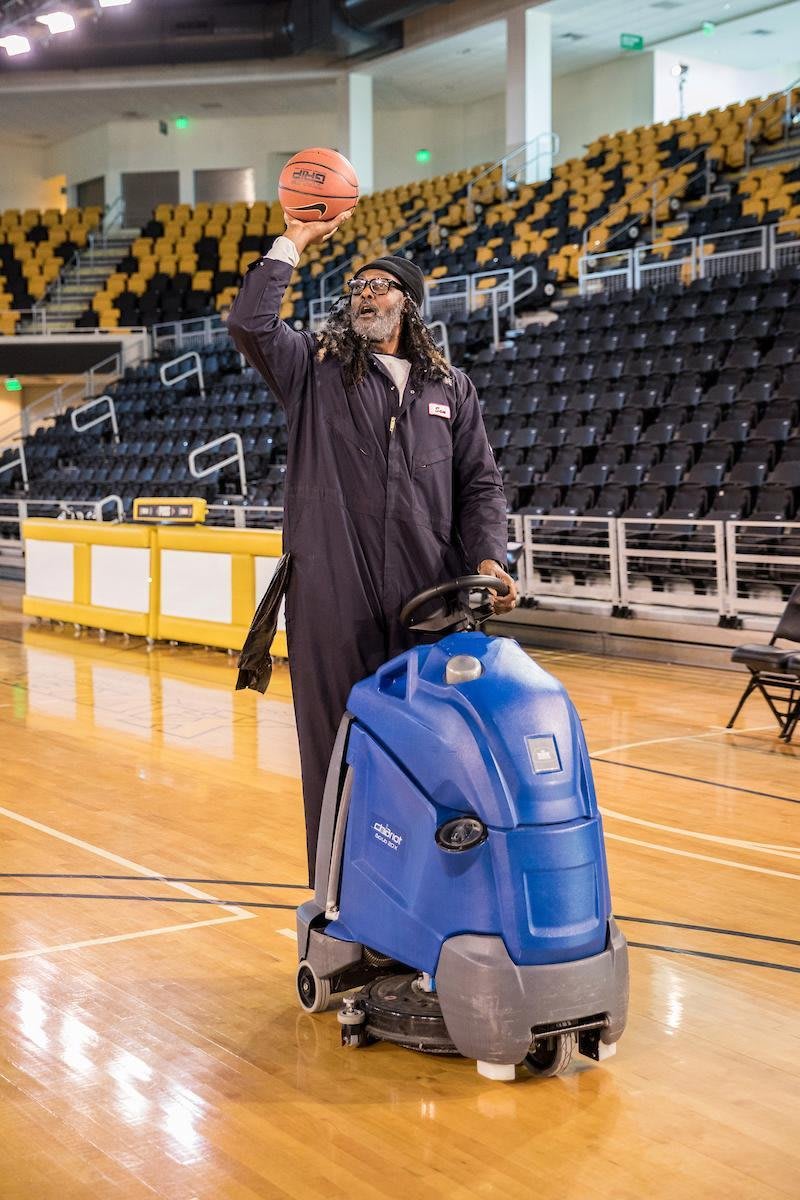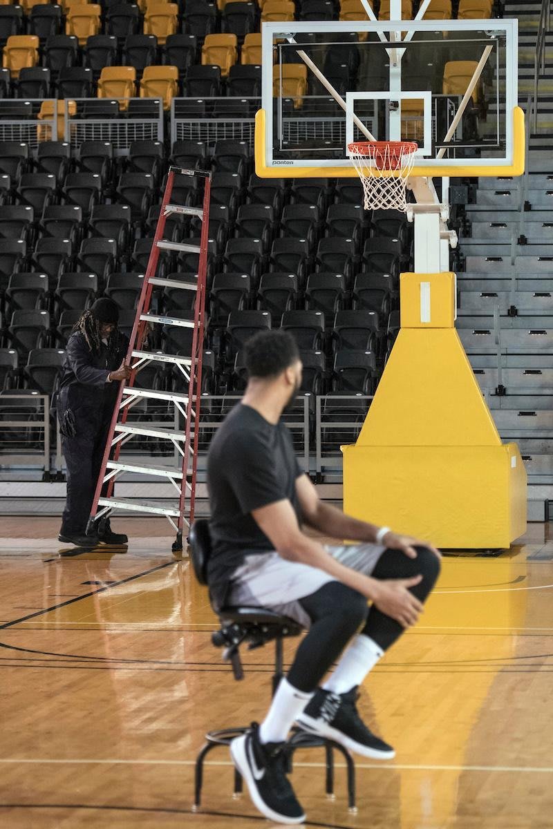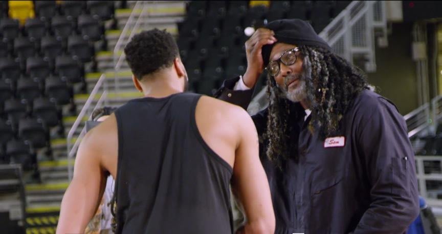 Before AD arrived to the gym, Malone got into character by “cleaning the glass” on the backboard. “I’m the tall old man on the pole so I guess I got to clean the glass,” Malone said, “which I love.”