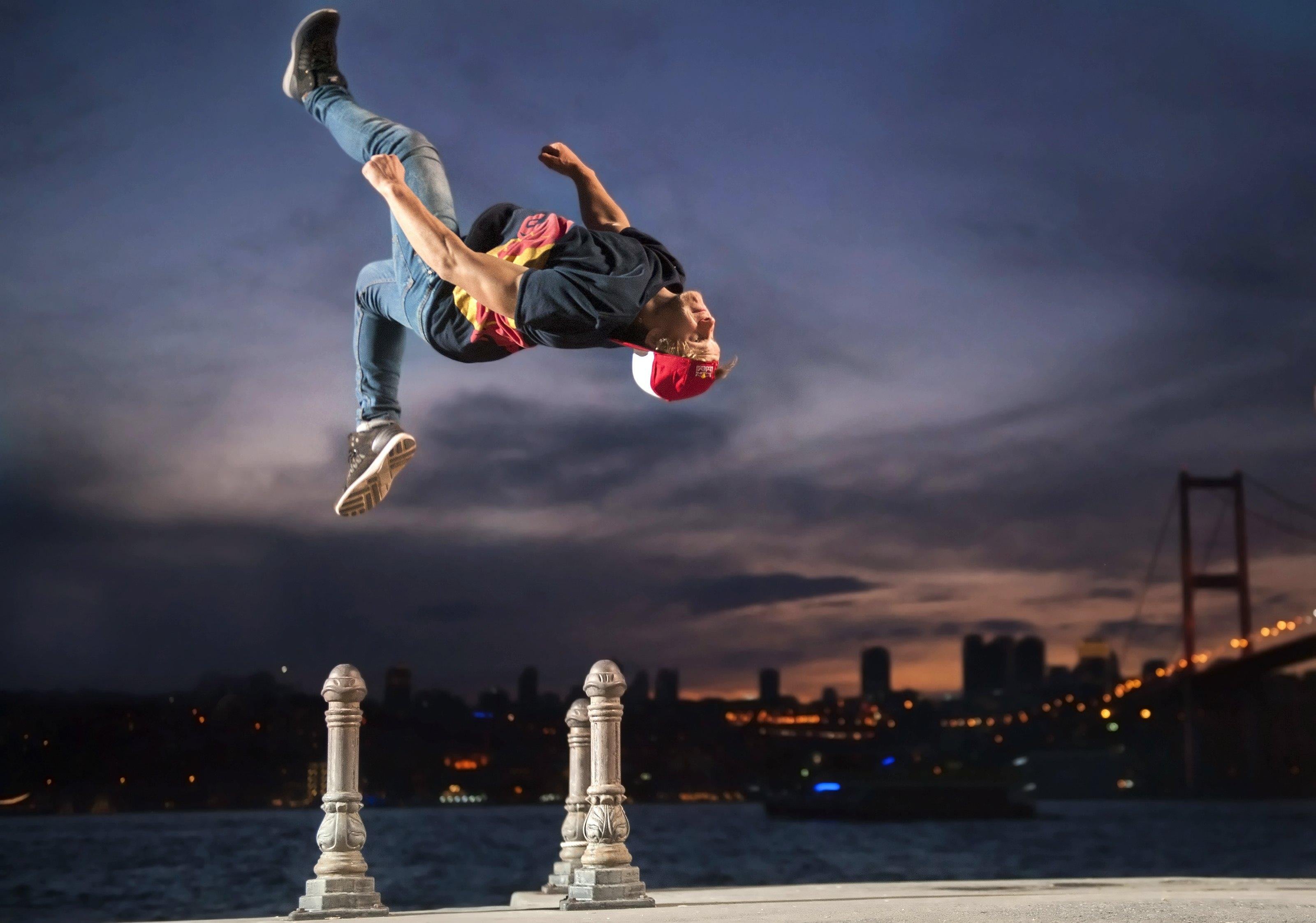 For Pasha, physical preparation is the foundation of his freerunning artistry. “What I noticed is that if I spend more time in the gym and put more work into my body to be physically stronger, I can create better art,” he explains. His training combines calisthenics, plyometrics and mobility work, alongside stretching. “I do stretching because I feel like stretching is very important – maybe even more than exercising with weights, especially for me because there are a lot of impacts,” he says. “If you’re flexible, you can take impacts in a very different way.”