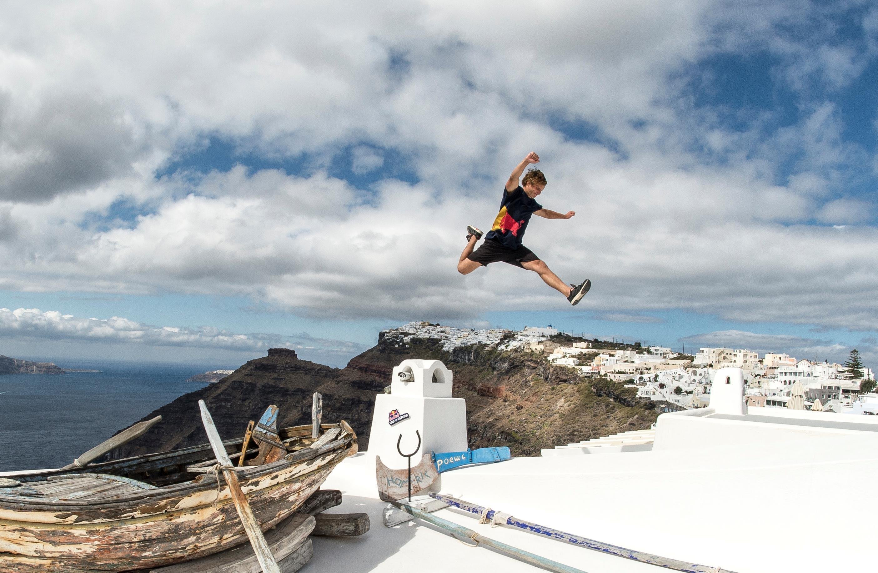 One of his most iconic stunts took place on Latvia’s sand dunes, where he performed a front flip dangerously close to the edge. “That one was one of the most viral,” he recalls. His more recent feats include cleverly staged falls from buildings, only to pull off an unexpected save at the last second. “...I have a big surprise element, to never let them [people] know your next move. Just when you think that you know what I'm doing, you don't,” he smirks.