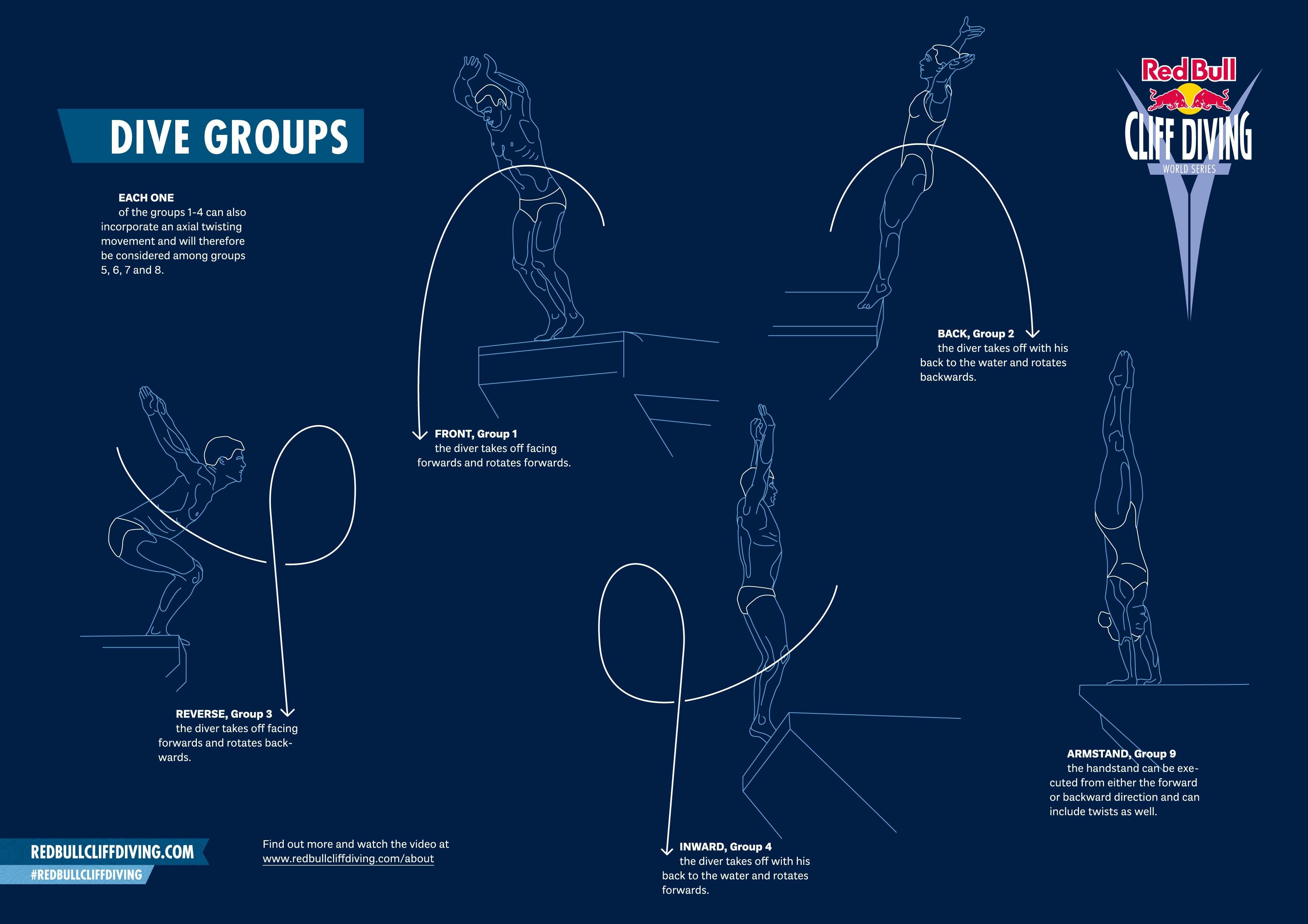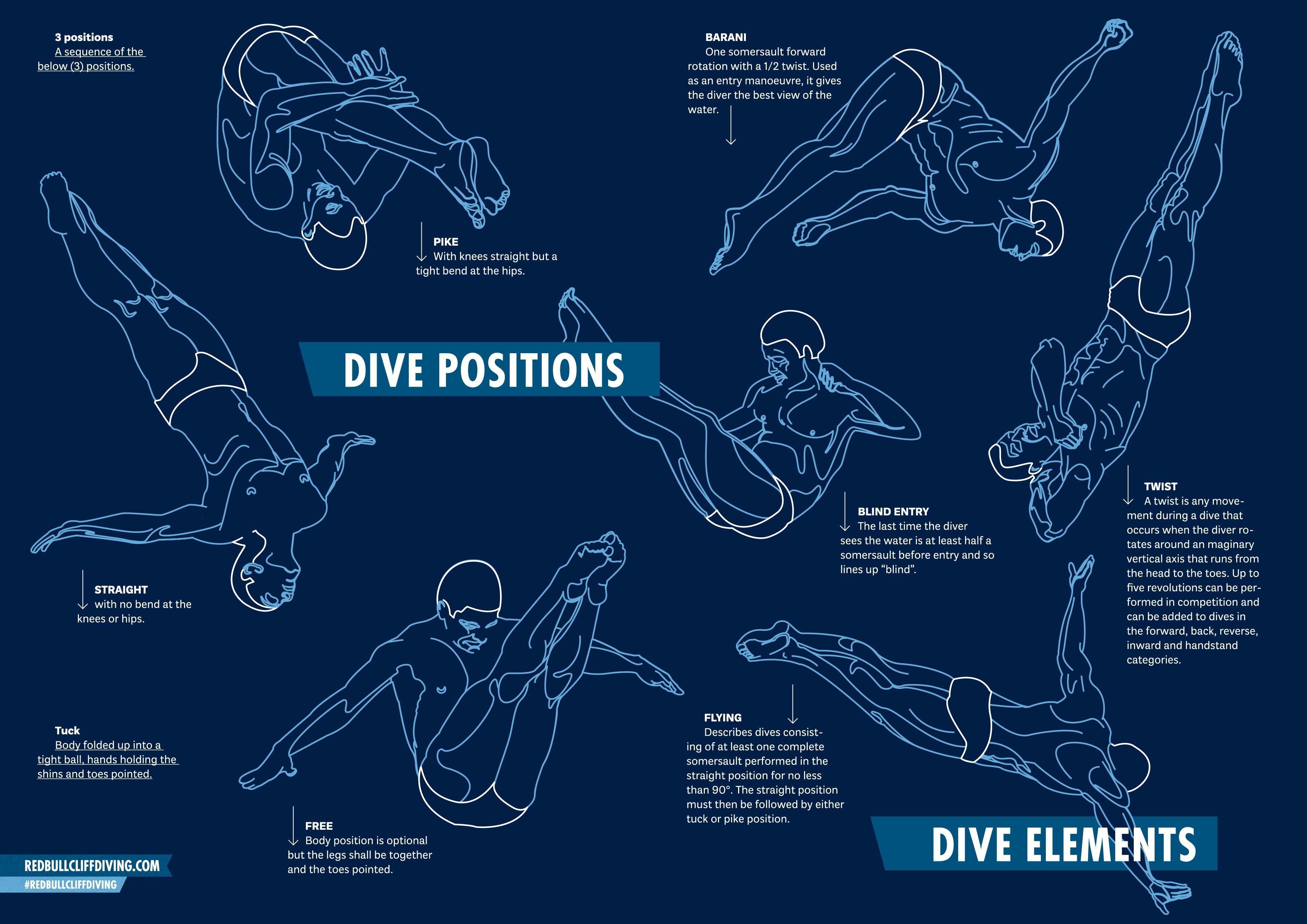 This is the chance to express yourself. There are various types of maneuvers including pikes, tucks, somersaults and twists, which can be combined to make for something truly spectacular. Find out more in our infographic below.
