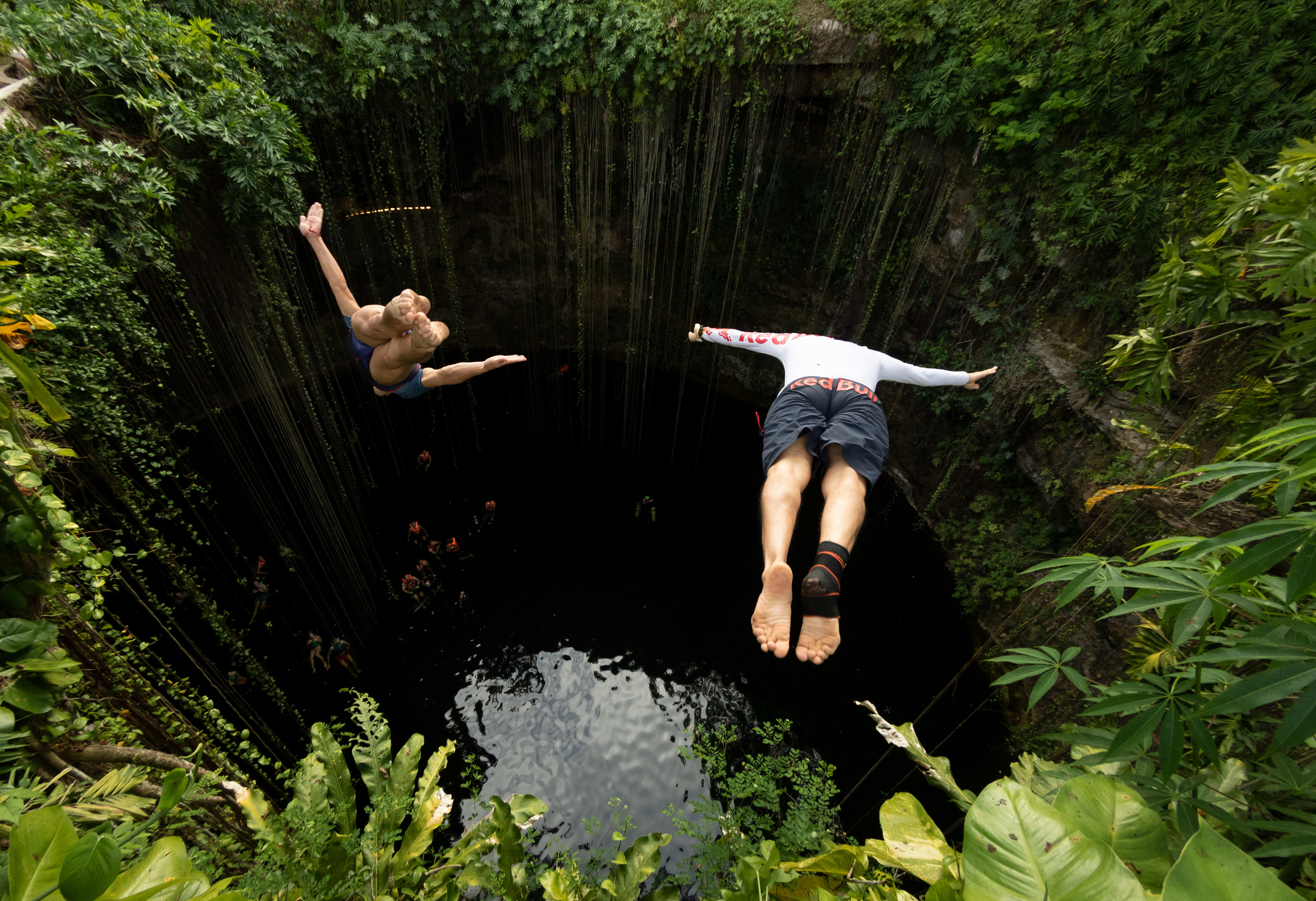 Orlando Duque and Jonathan Paredes dive into Cenote Ik Kil in Yucatán