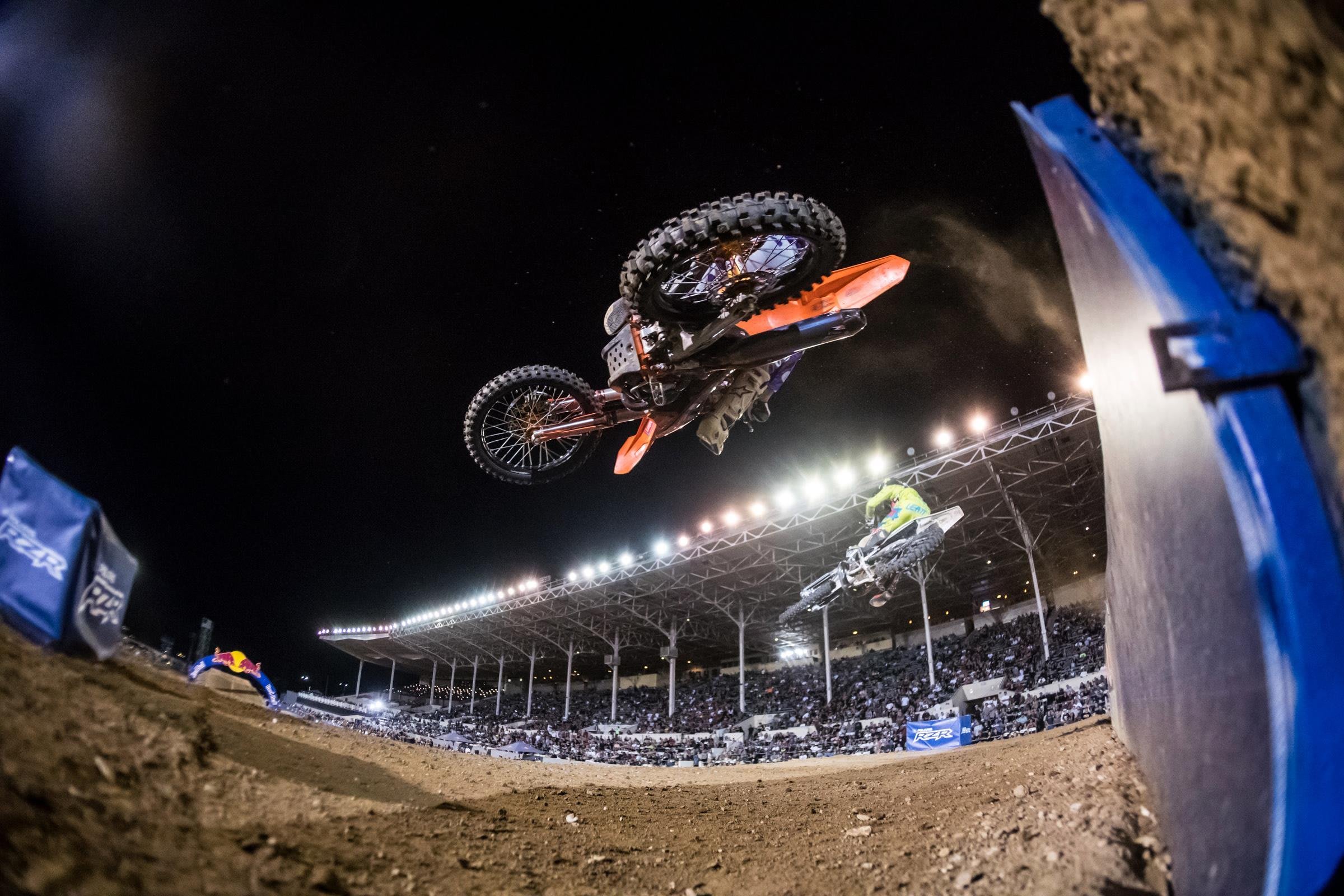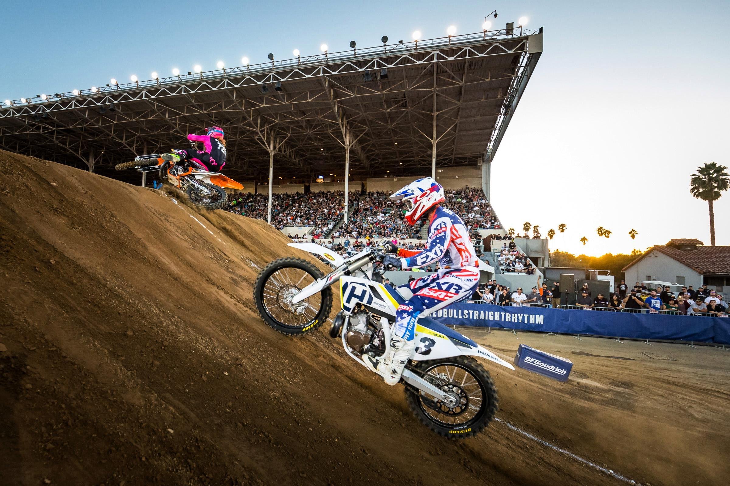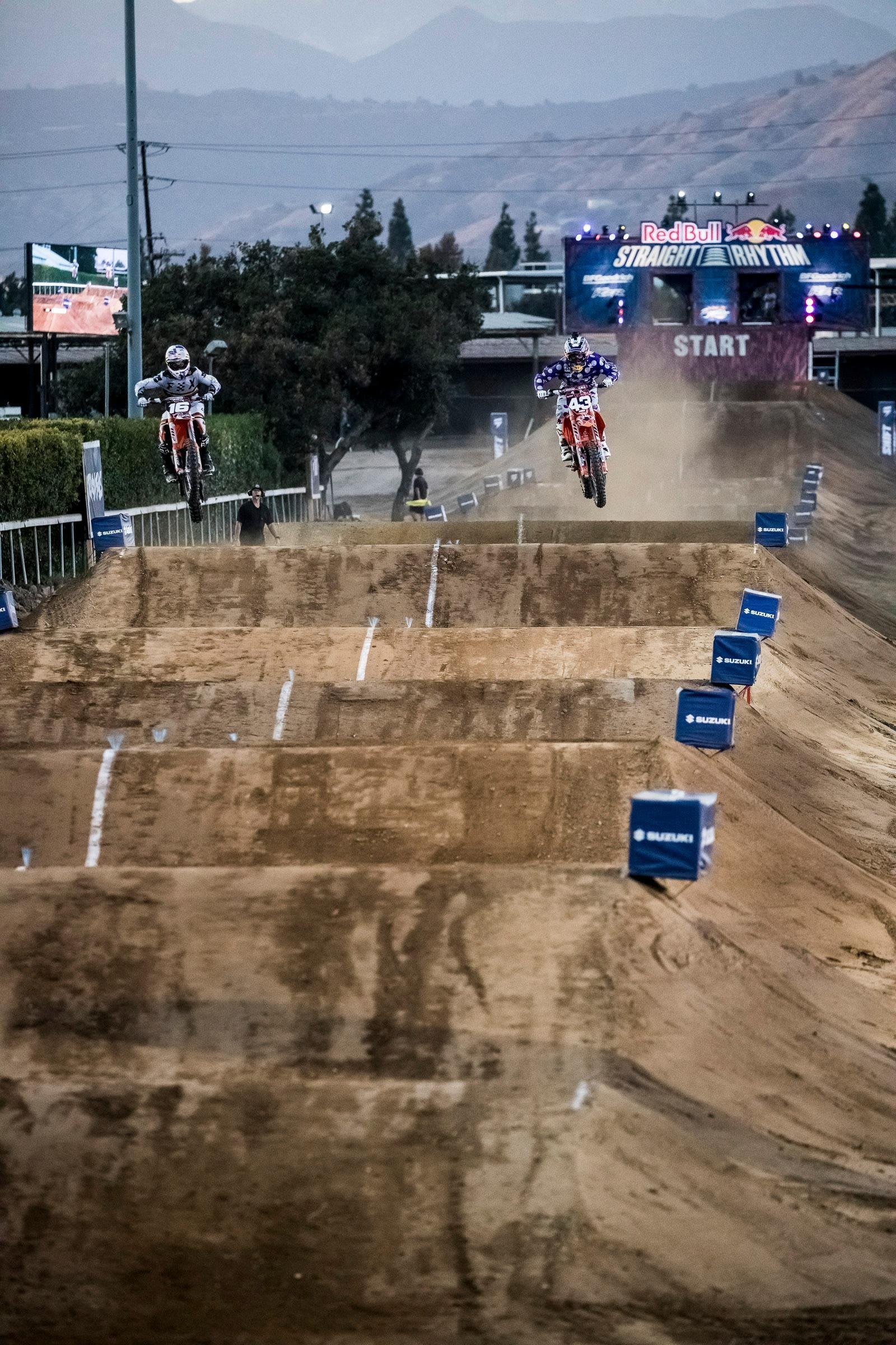Coming into the 2017 edition of Red Bull Straight Rhythm, Marvin Musquin had never lost a run down a straight rhythm track. Yes, you read that correctly, he’s won 100 percent of the times he’s lined up at the event. That said, the dark horses for the evening looked to be his teammate Broc Tickle and last year’s third place winner Josh Hansen. Returning Lites Class Champion Shane McElrath had a decent run in qualifying, making him a favorite, but it was Ryan Sipes on his Husky two-stroke who ended up fastest qualifying. The two-stroke class seemed to be a toss-up. Sipes was fastest in qualifying, Ryan Villopoto is Ryan Villopoto, therefore he couldn’t be counted out and Ronnie Mac has been claiming for weeks on social media that he won’t be denied. Let’s take a look at how it all shook out in Pomona.