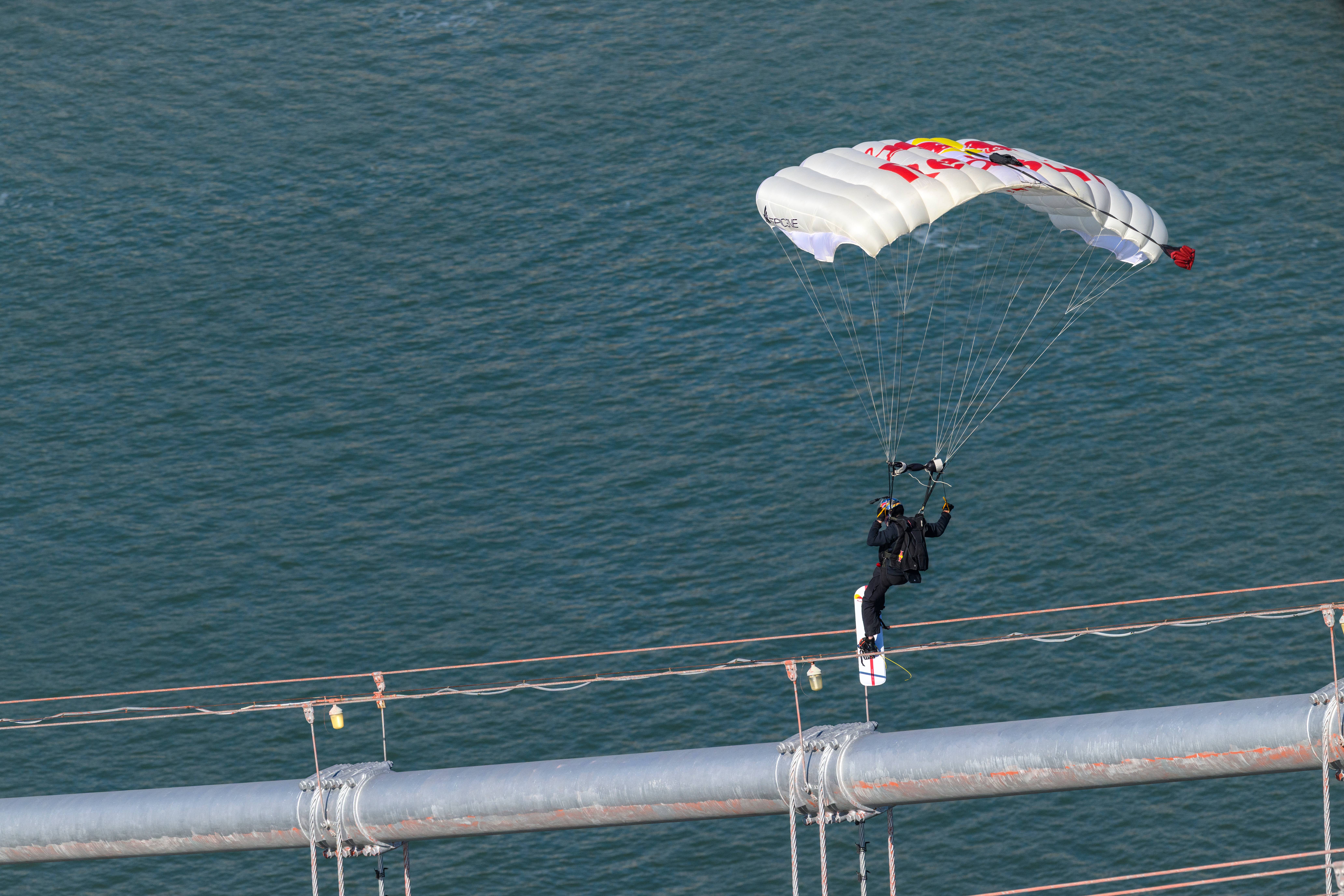 Since the beginning of time, humans’ athletic progression has been marked by monumental moments in the history of sport. And on August 23rd, adventure sports officially experienced one of those moments, as skysurfing innovator Sean MacCormac made history when he dove 5,000 feet out of a helicopter, skysurfed for nearly three minutes and rode down the suspension cables of one of the nation’s most iconic bridges: the San Francisco Bay Bridge. He then turned a hard right and floated down to a barge in the Bay where he landed safely. This endeavor was the brainchild of MacCormac, and he had been working arm-in-arm for eighteen months with the Red Bull team to make his dream a reality.