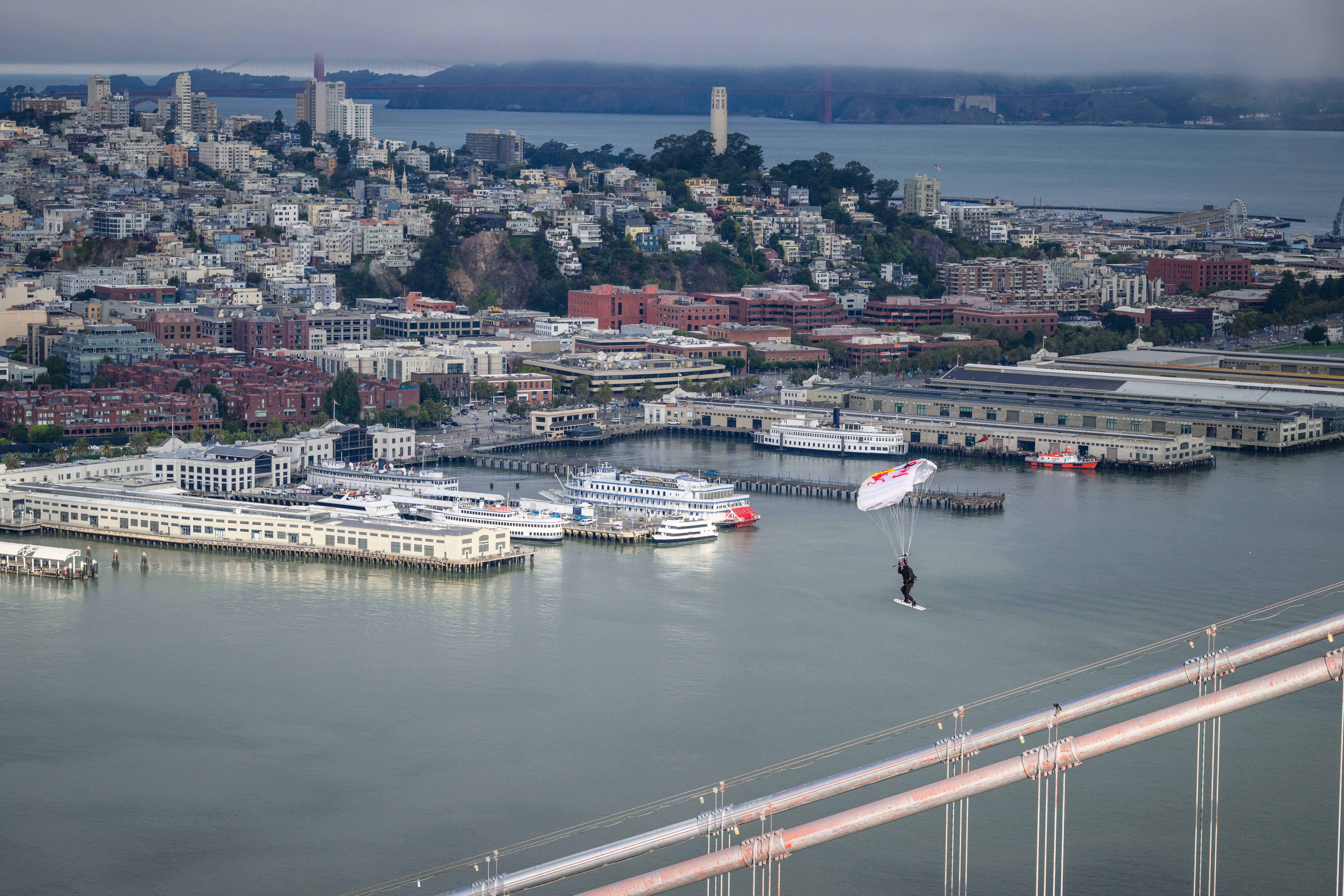 Pioneer of skysurfing and Red Bull Air Force legend Sean MacCormac skysurfs from 5,000 feet and rides San Francisco’s iconic Bay Bridge before landing on a floating barge