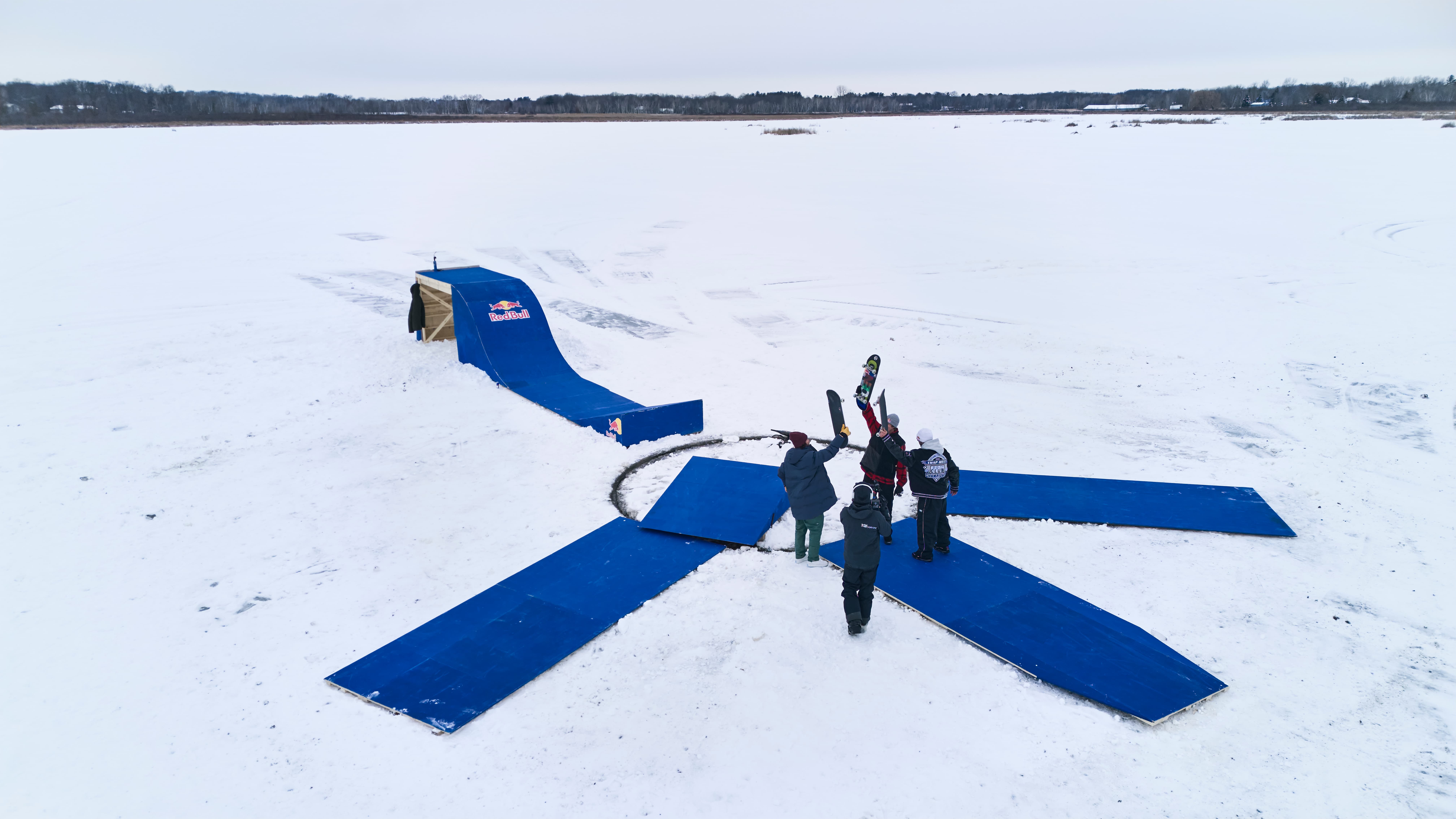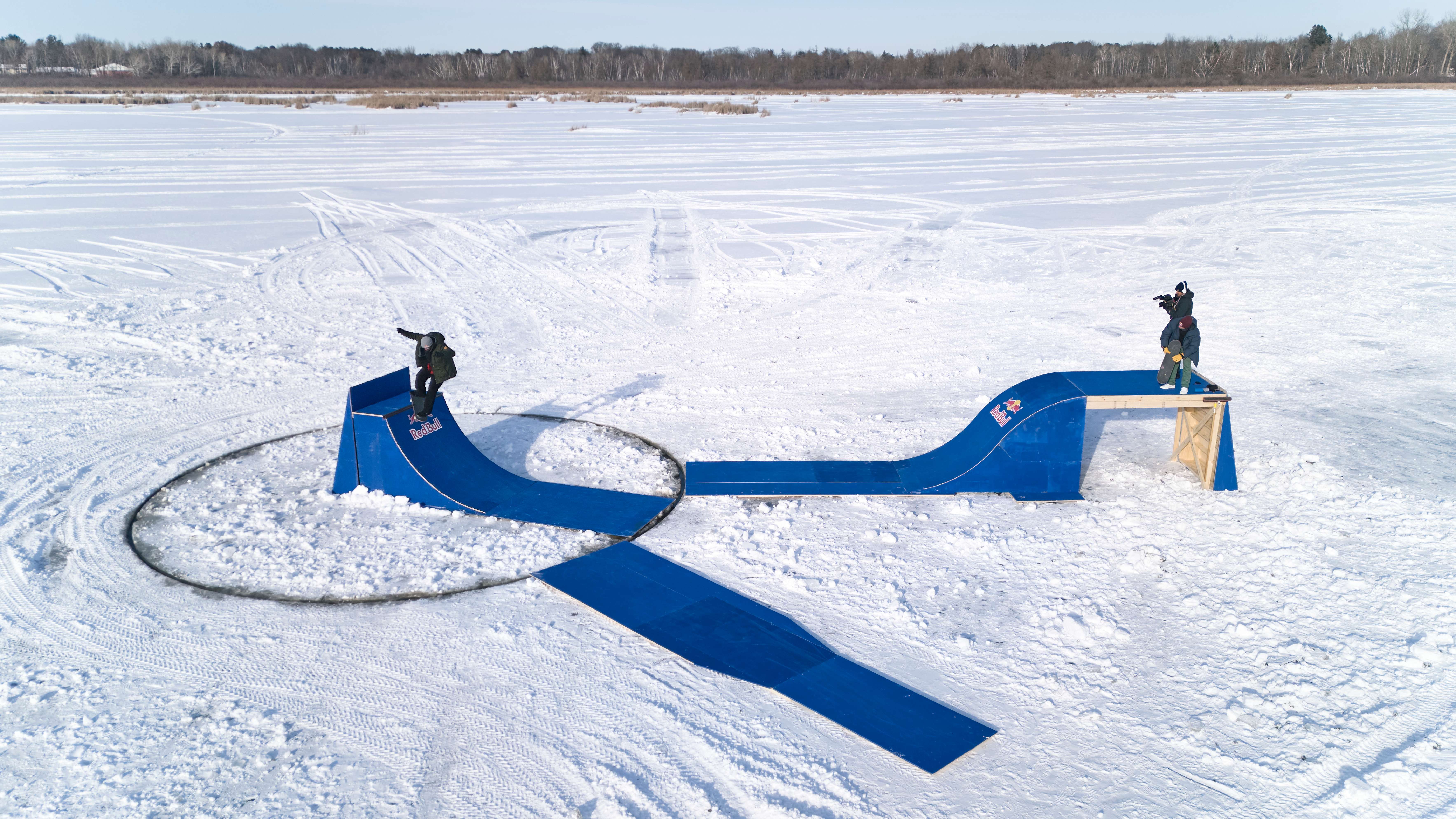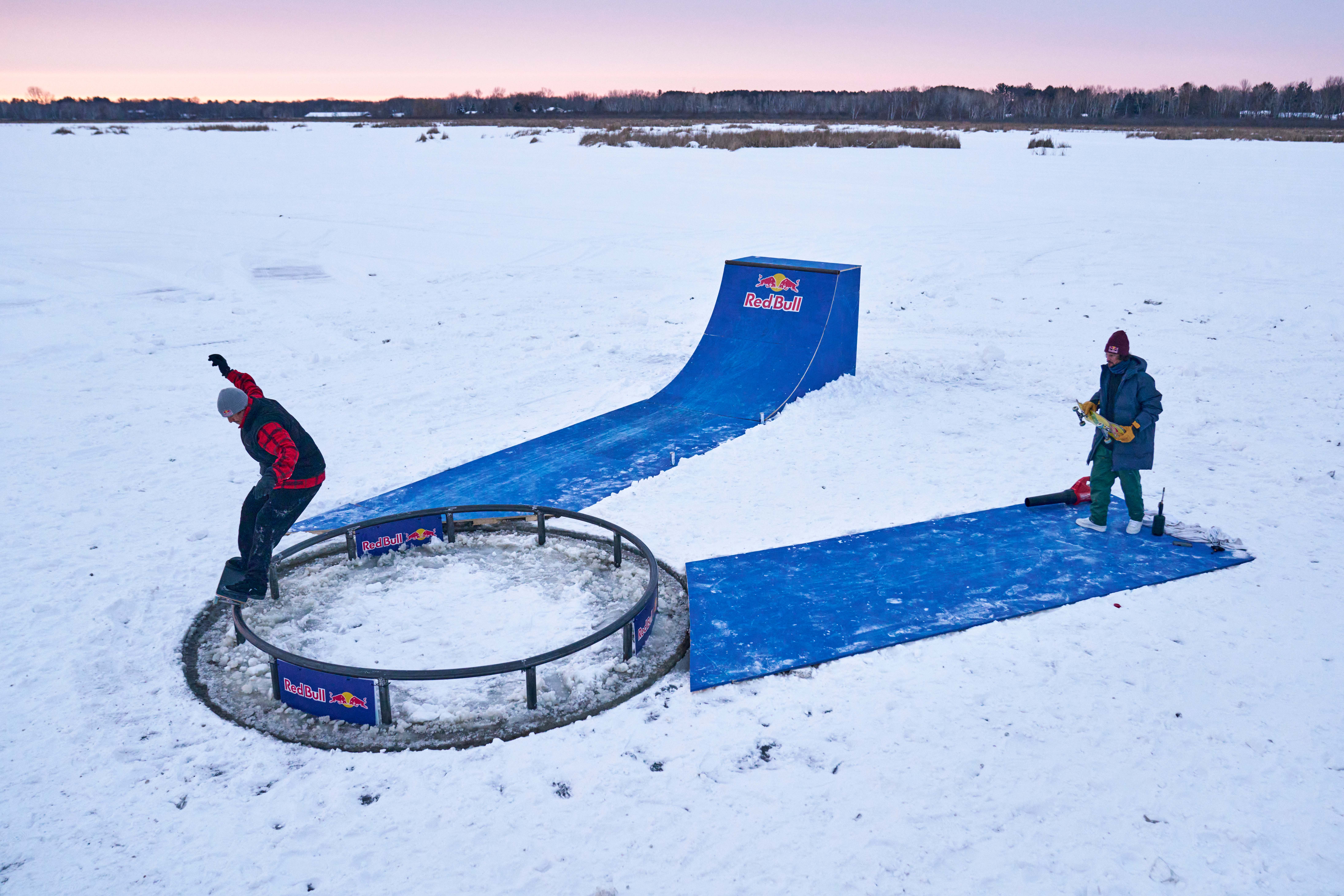 If you’re wondering how they got this idea and how this is even done, you’ve got to see what Dan Anderson does with his Minnesota neighborhood each year. He chainsaws a big circle in the ice, attaches an outboard motor to it, gets the whole plate spinning, and sets up a winter wonderland for everyone to enjoy. Pretty rad, right? Well, sooner or later someone would have to adopt this idea and see if they could make it skateable, right?