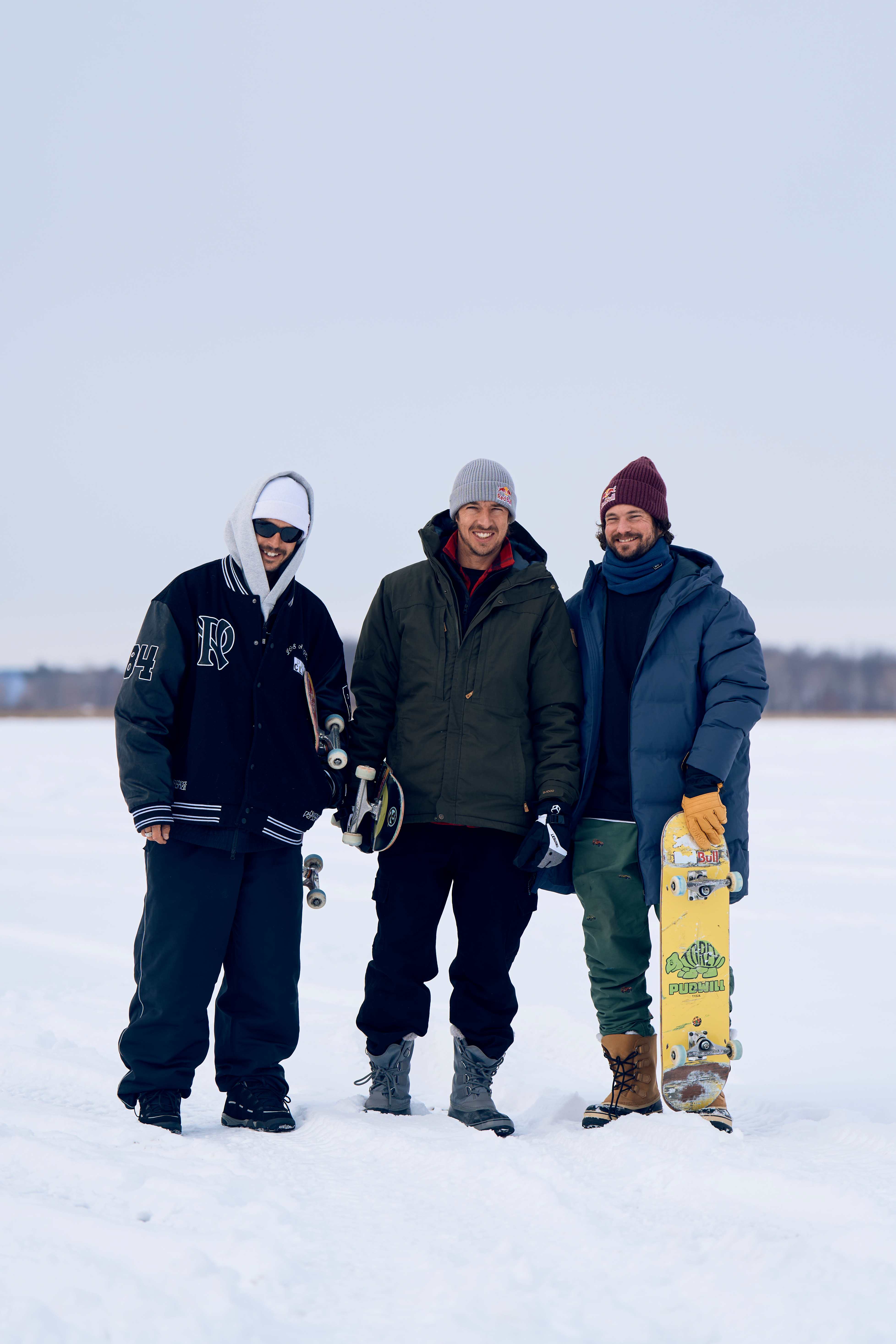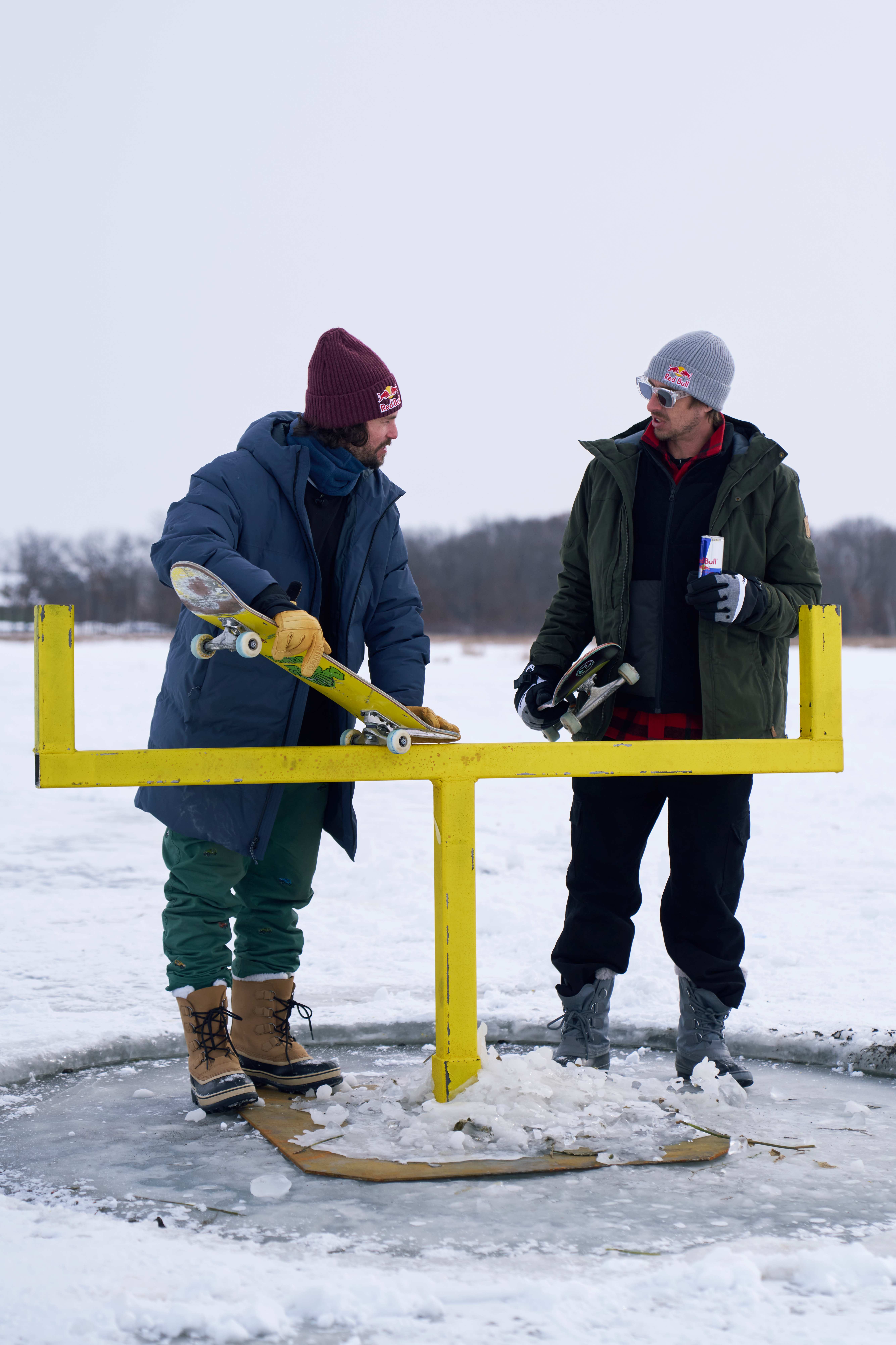 Pudwill goes on, “You had to wear as many layers as you could—five layers minimum. I had two pairs of socks, I had foot warmers on my socks and shoes. You had to walk out on the lake wearing snow boots, or else your skate shoes would get soaked. I had long johns, a pair of pants and another pair of pants over that, and you’re still freezing. I know TJ had snow pants on and then his pants on over it. I had a thermal shirt, long sleeve shirt, T-shirt, and one big ol’ jacket that went down to my knees, and I don’t like to skate with things on like pieces of flare, sunglasses, gloves, but you also had to wear the gardening gloves—big ‘ol snow gloves. So any time you had to adjust your board with the skate tool, you had to take the gloves off. One of the biggest challenges was just to get comfortable before you even started skating.”