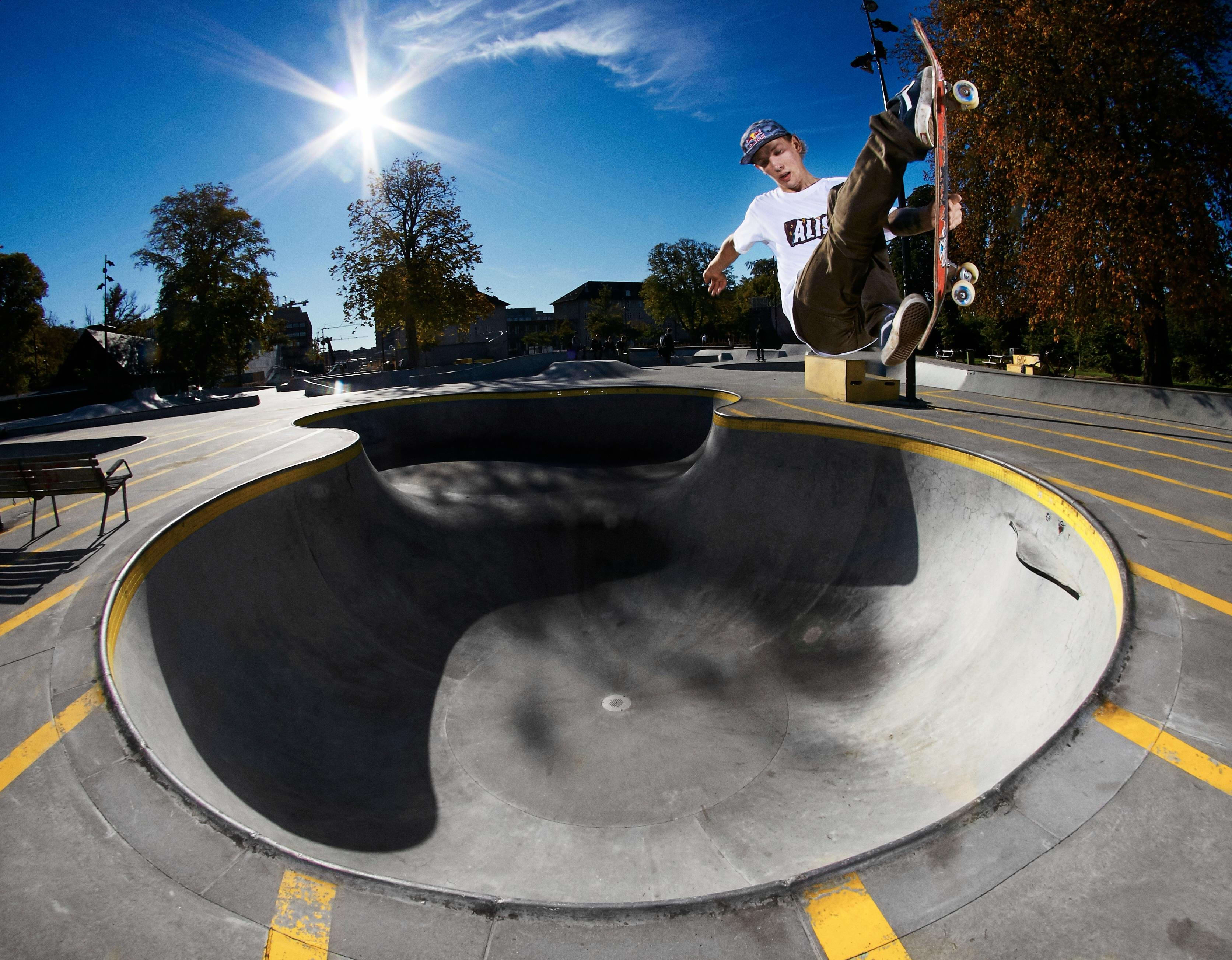 Surfers in California discovered that using a skateboard in a swimming pool was very similar to the feeling of surfing a wave. They soon started making ramps to mimic the shape of the pools which over the years slowly evolved into what we now call a vert ramp. There is no standard size but a vert ramp usually has two large quarter pipes which will have a foot or more of vertical ground at the top. Vert skating involves doing grinds and lip tricks on the coping of the ramp and using the speed generated by the ramp to make airs.