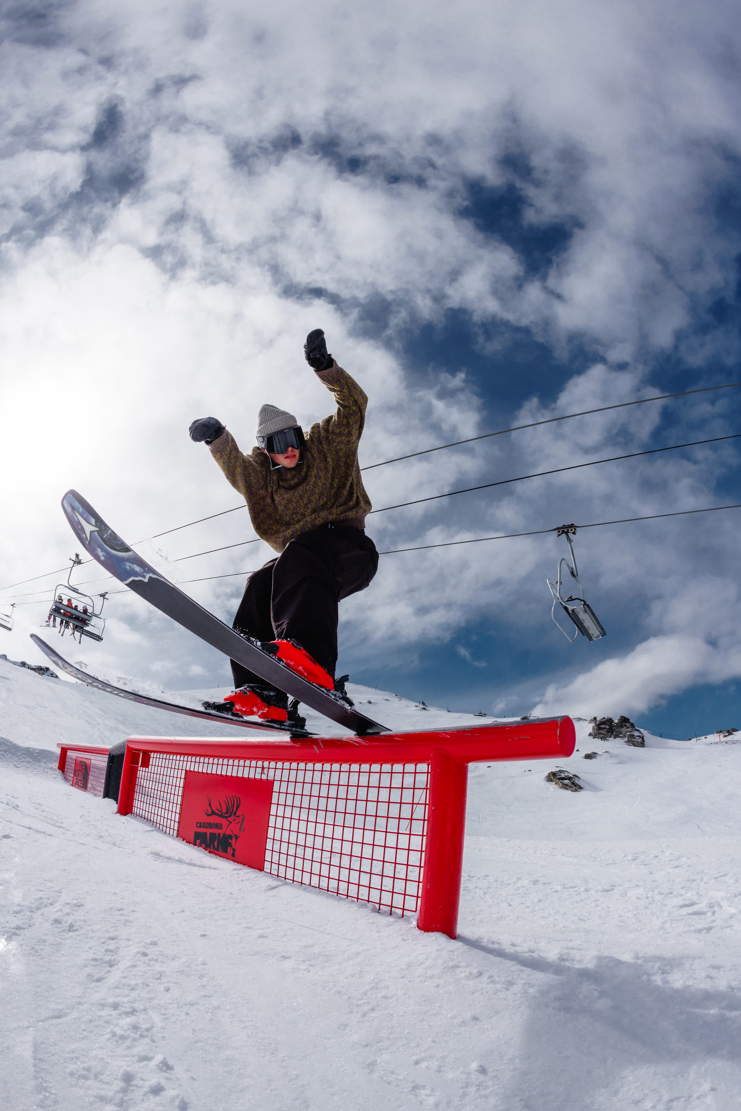 Definition: To ride your skis across anything that isn’t snow. If you hit a rail, a box or even grind a tree, you’re jibbing. The wider definition of jibbing can also include some fun or playful tricks on snow. Butters (see point 4) for example, would be included in jibbing.