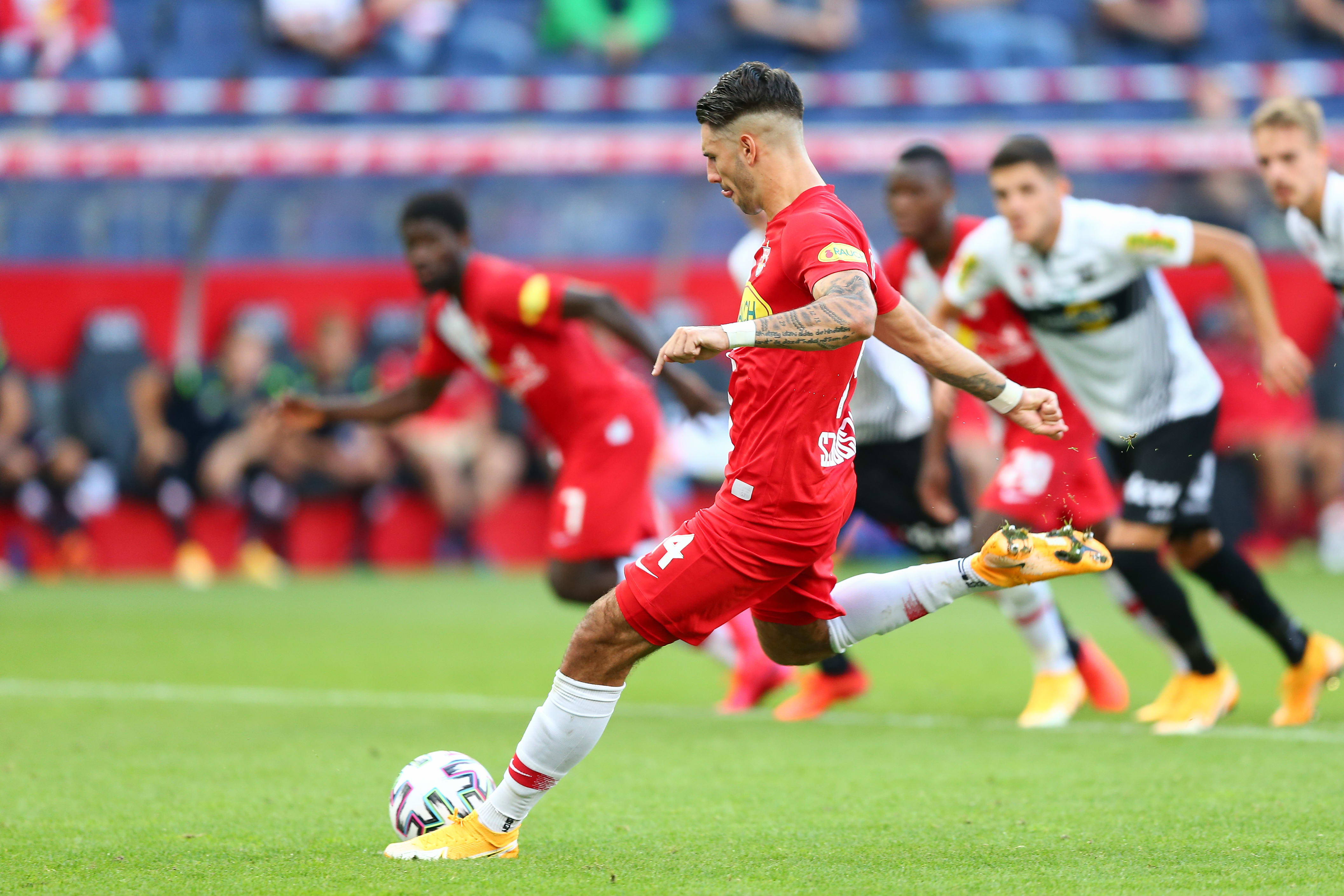 Late in a 1-1 contest, New York Red Bulls midfielder, Lewis Morgan is jostling for possession inside the penalty box before he gets dragged down by New England Revolution midfielder Thomas McNamara. After conferring with aides, the referee calls a penalty on the play and awards the Red Bulls a penalty kick.