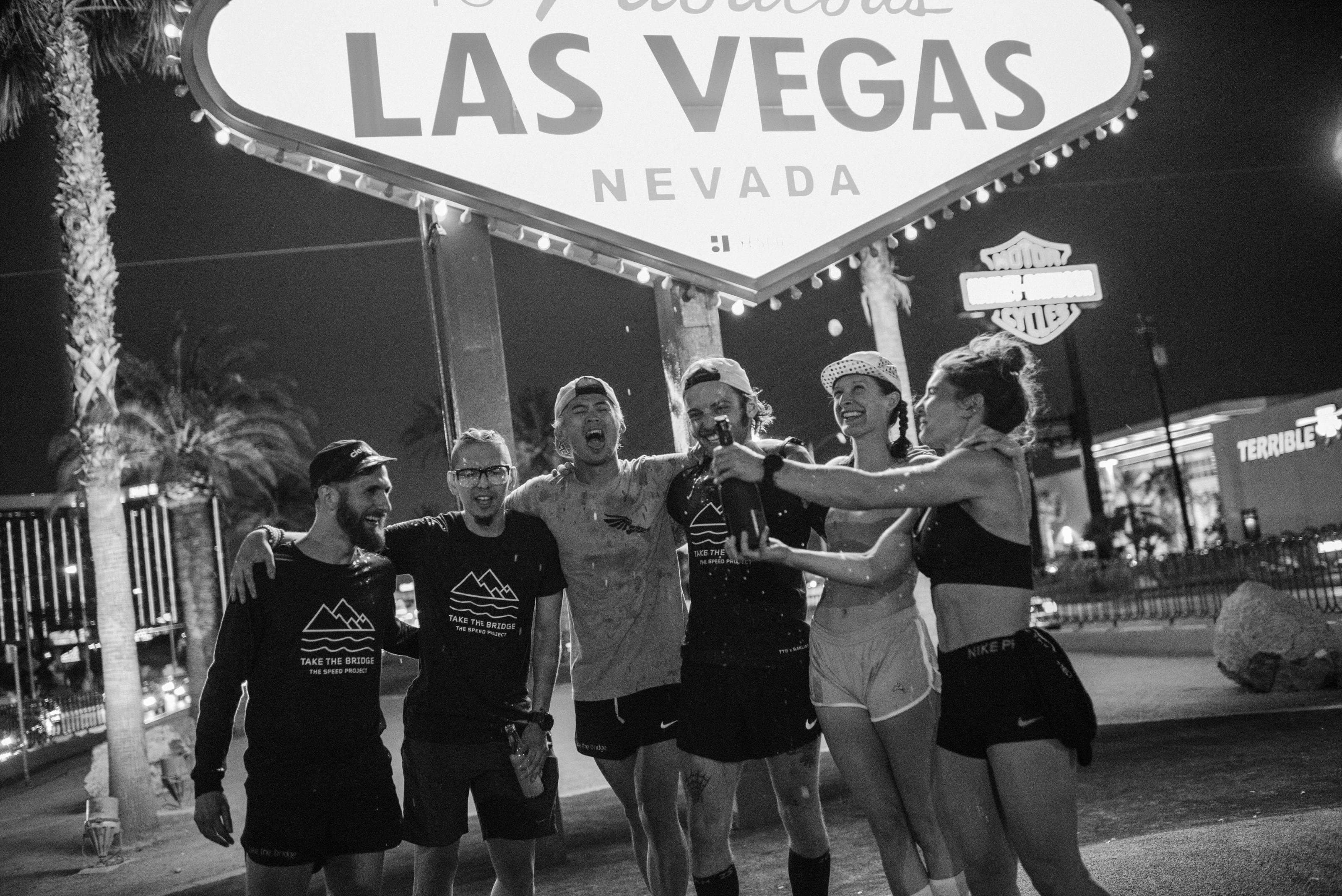The six runners of Take the Bridge complete the 344-mile race on foot from Santa Monica Pier to the Las Vegas Strip.