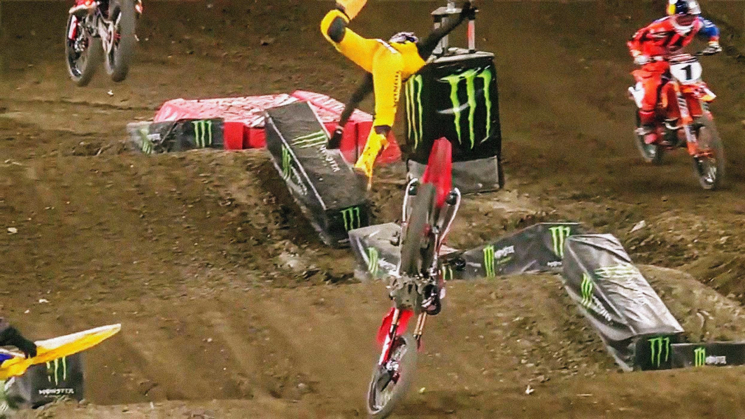 The crash immediately entered the pantheon of great motorsport smash-ups. When Roczen slammed into the dirt, the crowd of 40,000 at A2 (it’s the second race held in Anaheim each year) issued a stadium-rumbling groan, then fell silent.